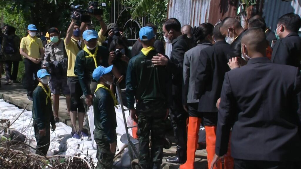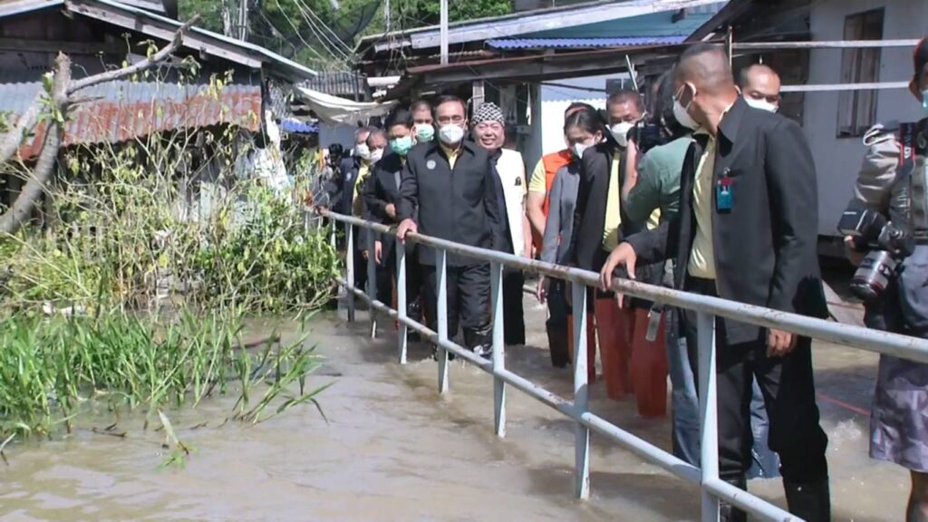 จากนั้น นายกรัฐมนตรี เดินลุยน้ำเข้าไปถึงบ้านที่ยังมีผู้สูงอายุอาศัยอยู่ พร้อมพูดคุยทักทายประชาชนในชุมชนอย่างเป็นกันเอง ขณะเดียวกันยังให้กำลังใจกับผู้ประสบภัยและย้ำว่าจะช่วยดูแลให้ความช่วยเหลือ ขอให้ประชาชนสู้เพื่อประเทศไทย ถึงจะมีปัญหาอยู่บ้างแต่ก็ดีกว่าหลายประเทศ ขณะเดียวกันประชาชนบางคนขอให้นายกฯ นำไดโว่มาเร่งสูบน้ำออกจากบ้านเรือน ซึ่งนายกฯ ก็ได้ถามกลับว่าหากสูบออกแล้ว จะไปกระทบกับบ้านหลังอื่นหรือไม่ หากไม่กระทบก็พร้อมที่จะดำเนินการให้โดยจะเร่งสั่งการให้เจ้าหน้าที่เข้ามาดำเนินการ พร้อมกันนี้ นายกฯ ยังให้กำลังใจทหารที่ช่วยกันบรรจุกระสอบทรายทำผนังกั้นน้ำให้ชาวบ้าน