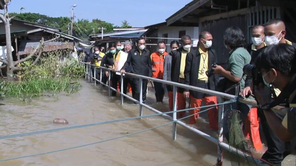 นนทบุรี 13 ต.ค.- นายกฯ นำคณะตรวจสถานการณ์น้ำชุมชนริมเจ้าพระยา ท่าอิฐ เมืองนนท์ ลุยน้ำท่วมเคาะประตูบ้านให้กำลังใจผู้ประสบภัย