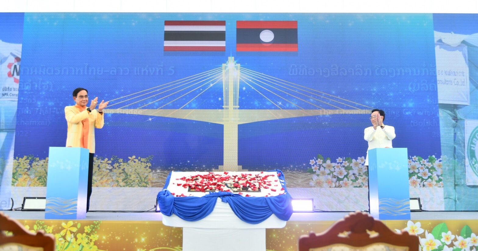 พลเอกประยุทธ์ จันทร์โอชา นายกรัฐมนตรีและรัฐมนตรีว่าการกระทรวงกลาโหมพร้อมด้วย นายพันคำ วิพาวัน นายกรัฐมนตรีสาธารณรัฐประชาธิปไตยประชาชนลาว เป็นประธานในพิธีวางศิลาฤกษ์ การก่อสร้างสะพานมิตรภาพไทย – ลาว แห่งที่ 5 บึงกาฬ -บอลิคำไซ ฝั่งไทย นายกรัฐมนตรี กล่าวว่า รู้สึกเป็นเกียรติที่ได้เป็นประธานร่วมกับนายกรัฐมนตรี สปป. ลาว ในพิธีวางศิลาฤกษ์โครงการก่อสร้างสะพานมิตรภาพไทย – ลาว แห่งที่ 5 (บึงกาฬ – บอลิคำไซ) ซึ่งถือเป็นโครงการที่มีความสำคัญเพื่อส่งเสริมความเชื่อมโยงระหว่างทั้งสองประเทศ และเป็นความคืบหน้าสำคัญจากการหารือของนายกรัฐมนตรีทั้งสองประเทศ เมื่อครั้งนายกรัฐมนตรี สปป. ลาว เยือนไทยอย่างเป็นทางการ เมื่อต้นเดือนมิถุนายน 2565 สะท้อนซึ่งความสัมพันธ์อันดี เป็นเพื่อนบ้านที่ใกล้ชิดกันในทุกระดับ มีการพึ่งพาอาศัยซึ่งกันและกันเสมอมา