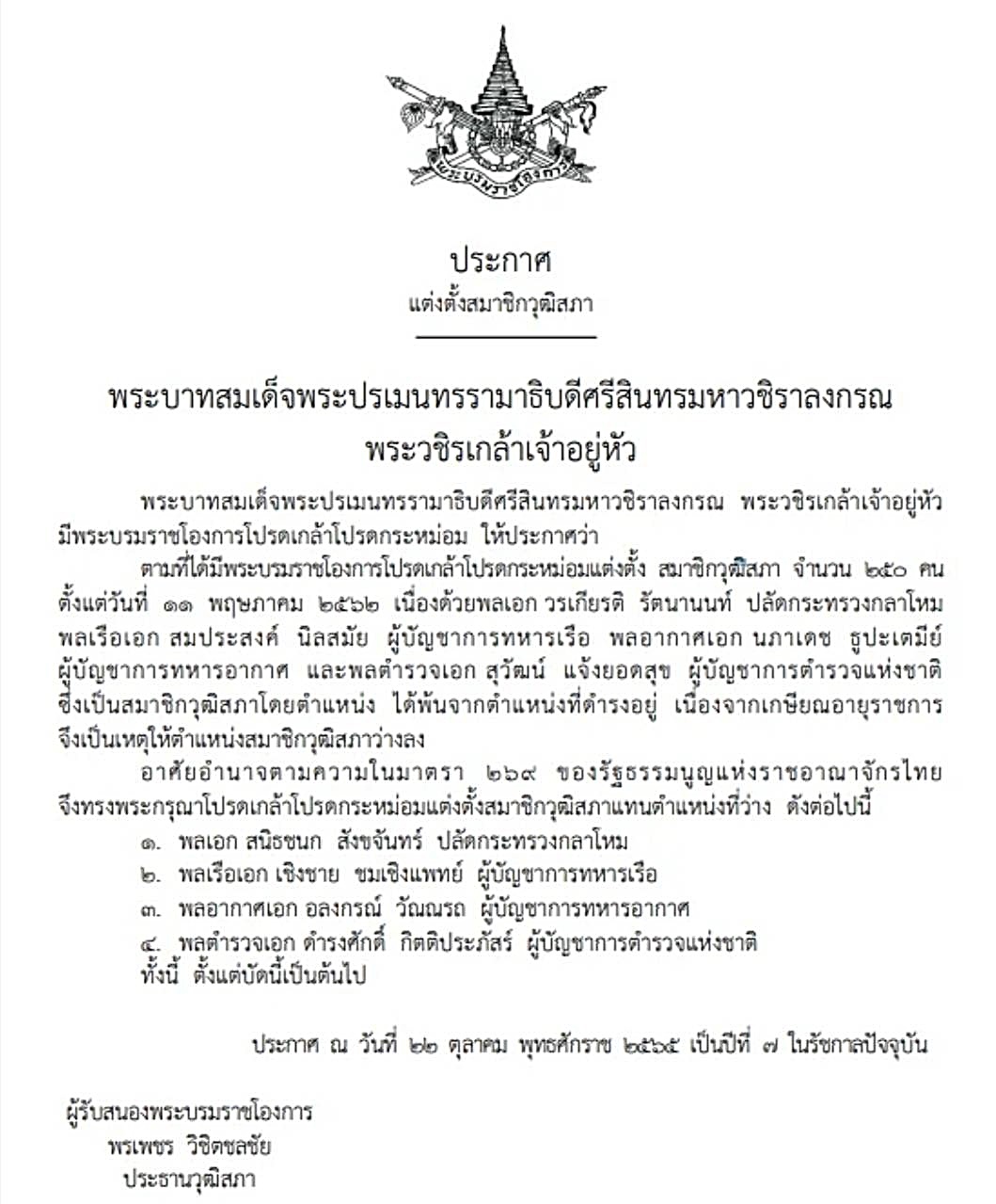 ราชกิจจานุเบกษาเผยแพร่ประกาศแต่งตั้งสมาชิกวุฒิสภา(ส.ว.) แทนตำแหน่งที่ว่าง จำนวน 2 ฉบับ โดยเป็นประกาศแต่งตั้ง พล.อ.สมศักดิ์ นิลบรรเจิดกุล เป็นสมาชิกวุฒิสภาแทนพล.ร.อ.ชุมนุม อาจวงษ์ สมาชิกวุฒิสภาที่ถึงแก่อนิจกรรม และอีกฉบับเป็นประกาศแต่งตั้งผู้นำเหล่าทัพ เป็นสมาชิกวุฒิสภา แทนผู้นำเหล่าทัพที่พ้นจากตำแหน่ง เนื่องจากเกษียณอายุราชการ ประกอบด้วย พล.อ.สนิธชนก สังขจันทร์ ปลัดกระทรวงกลาโหม พล.ร.อ.เชิงชาย ชมเชิงแพทย์ ผู้บัญชาการทหารเรือ พล.อ.อ.อลงกรณ์ วัณณรถ ผู้บัญชาการทหารอากาศ และพล.ต.อ.ดำรงศักดิ์ กิตติประภัสร์ ผู้บัญชาการตำรวจแห่งชาติ ทั้งนี้ ตั้งแต่วันที่ 22 ตุลาคม 2565 เป็นต้นไป โดยมีนายพรเพชร วิชิตชลชัย ประธานวุฒิสภา เป็นผู้รับสนองพระบรมราชโองการ