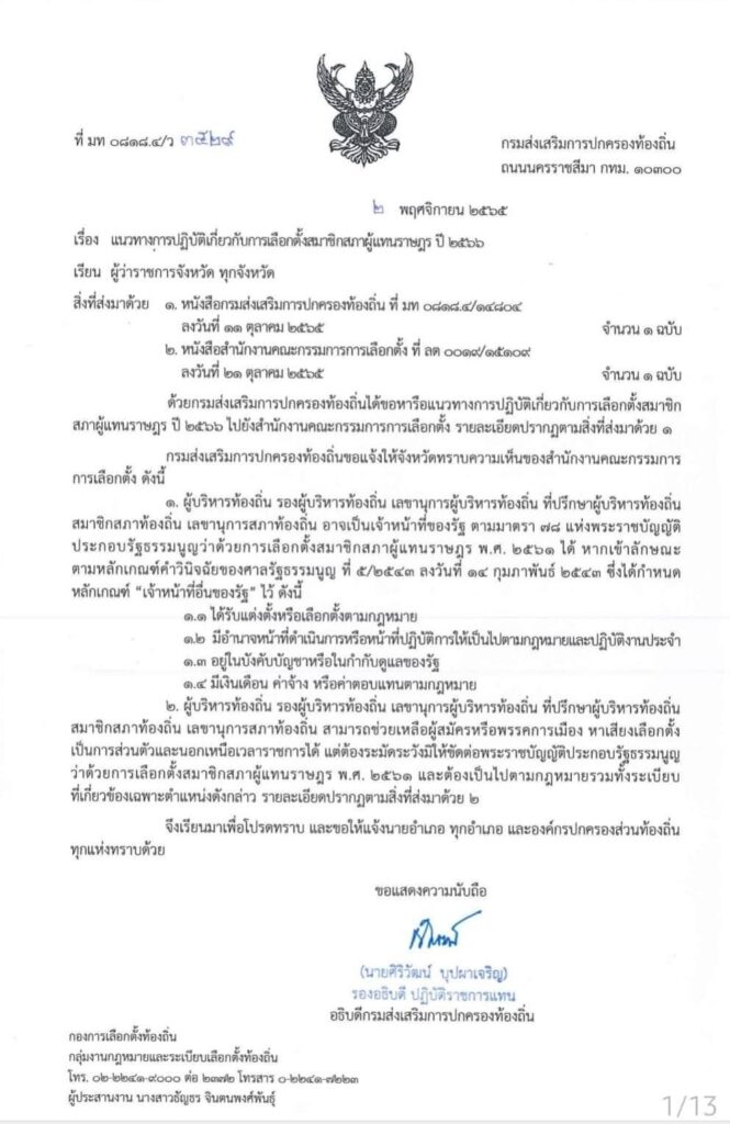 ผู้สื่อข่าวรายงานว่าก่อนหน้านี้ นายศิริวัฒน์ บุปผาเจริญ รองอธิบดี ปฏิบัติราชการแทนอธิบดีกรมส่งเสริมการปกครองส่วนท้องถิ่น ได้มีหนังสือหารือเรื่องแนวทางการปฏิบัติเกี่ยวกับการเลือกตั้ง ส.ส. 2566 มายังเลขาธิการ กกต. โดยเป็นการขอความชัดเจนว่าในช่วง 180 วัน ก่อนสภาผู้แทนราษฎรชุดปัจจุบันจะครบวาระการดำรงตำแหน่งในวันที่ 23 มีนาคม 2566 นั้น ผู้บริหารท้องถิ่น รองผู้บริหารท้องถิ่น เลขานุการผู้บริหารท้องถิ่น ที่ปรึกษาผู้บริหารท้องถิ่น สมาชิกสภาท้องถิ่น เลขานุการสภาท้องถิ่น ถือเป็นเจ้าหน้าที่ของรัฐตามมาตรา 78 วรรคหนึ่ง พ.ร.ป.ว่าด้วยการเลือกตั้งส.ส. 2561 ที่ห้ามใช้ตำแหน่งหน้าที่โดยมิชอบ ในการช่วยเหลือผู้สมัคร พรรคการเมืองในการหาเสียงเลือกตั้งหรือไม่ และถ้าไปช่วยผู้สมัครหรือพรรคการเมืองหาเสียงเลือกตั้งโดยส่วนตัว ไม่ได้ใช้ตำแหน่งหน้าที่ นอกเวลาราชการ ไม่ใช้ทรัพยากรของรัฐ จะสามารถทำได้หรือไม่เพียงไร