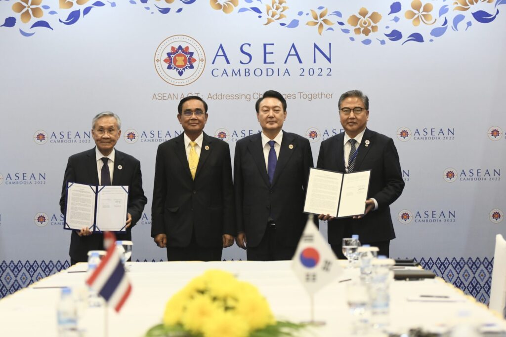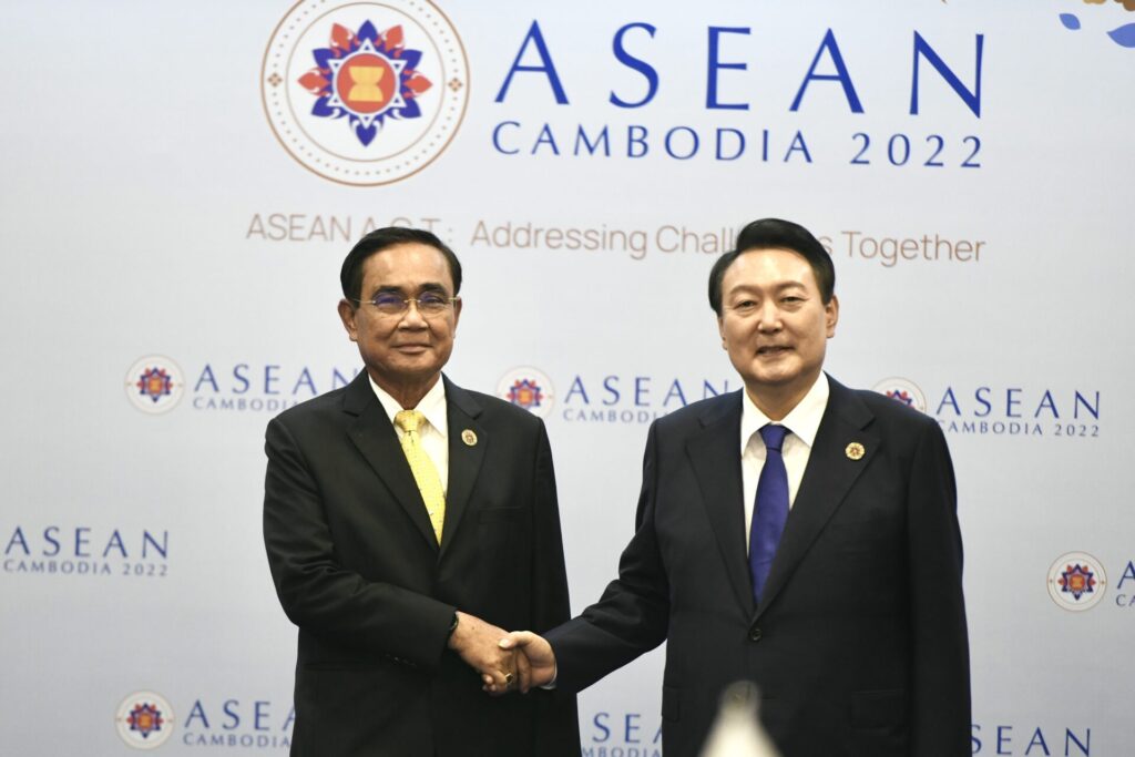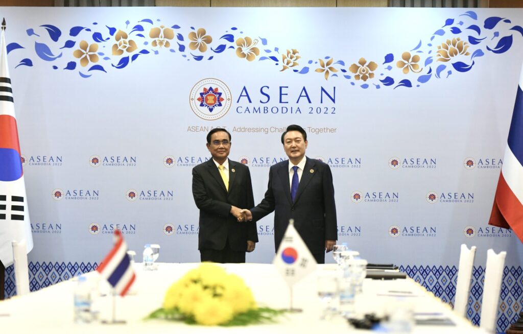 พลเอกประยุทธ์ จันทร์โอชา นายกรัฐมนตรีและรัฐมนตรีว่าการกระทรวงกลาโหม หารือกับนายยุน ซ็อก-ย็อล ประธานาธิบดีแห่งสาธารณรัฐเกาหลี (เกาหลีใต้) ในช่วงการประชุมสุดยอดอาเซียน ครั้งที่ 40 และ 41 และการประชุมสุดยอดที่เกี่ยวข้อง ที่กรุงพนมเปญ ประเทศกัมพูชา เพื่อทำความรู้จักกันอย่างเป็นทางการครั้งแรก ภายหลังจากที่ประธานาธิบดียุน ซ็อก-ย็อล เข้ารับตำแหน่ง และยืนยันความพร้อมที่จะส่งเสริมความร่วมมือกับรัฐบาลเกาหลีใต้