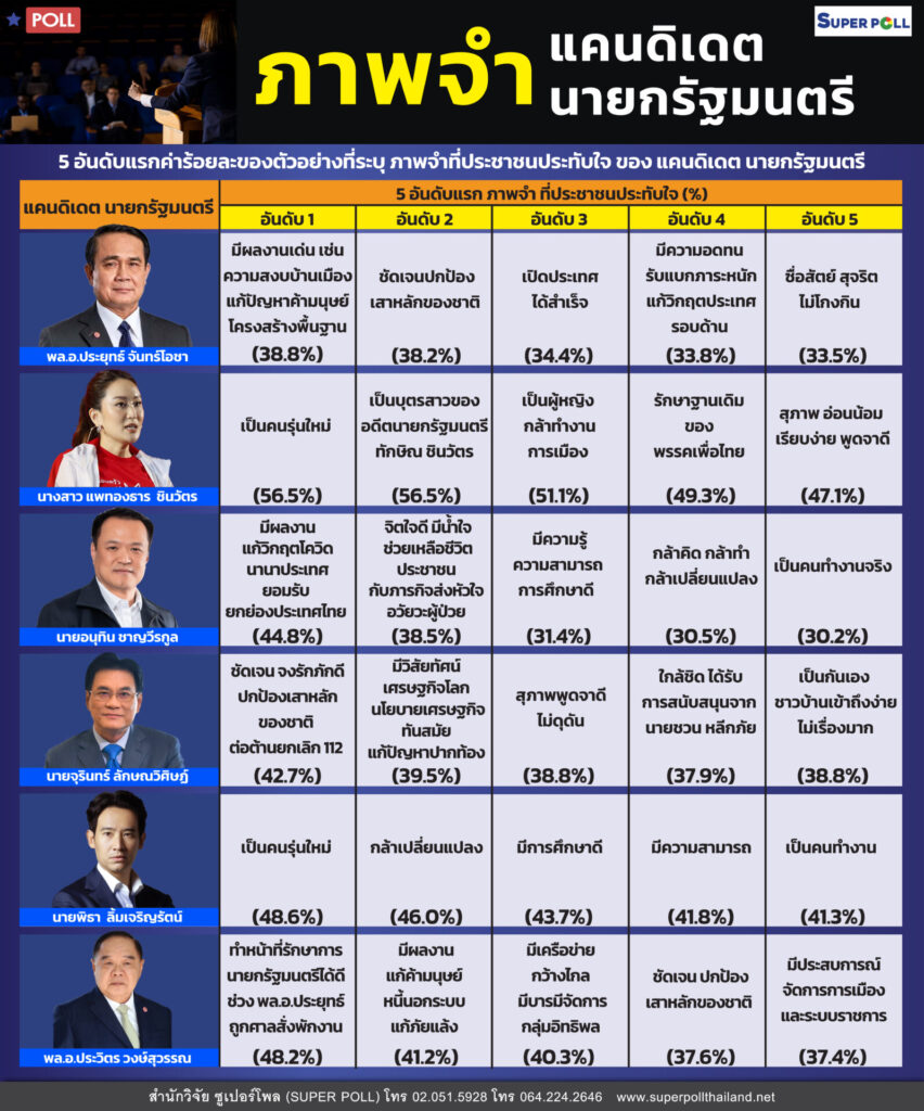 ผศ.ดร.นพดล กรรณิกา ผู้อำนวยการสำนักวิจัยซูเปอร์โพล (SUPER POLL) เปิดเผยถึงผลสำรวจเรื่อง “ภาพจำแคนดิเดตนายกรัฐมนตรี” กรณีศึกษาประชาชนทุกสาขาอาชีพทั่วประเทศ ดำเนินโครงการทั้งการวิจัยเชิงปริมาณ (Quantitative Research) และการวิจัยเชิงคุณภาพ (Qualitative Research) จากผู้ถามผู้ตอบและเครื่องมือวัด จำนวน 1,108 ตัวอย่าง ระหว่างวันที่ 8-12 พ.ย.65 ที่ผ่านมา โดยพบว่า 5 อันดับแรก ภาพจำที่ประชาชนประทับใจของ พล.อ.ประยุทธ์ จันทร์โอชา ได้แก่ อันดับแรก มีผลงานเด่น เช่น ความสงบบ้านเมือง แก้ปัญหาค้ามนุษย์ โครงสร้างพื้นฐาน (38.8%) รองลงมาอันดับที่ 2 คือ ชัดเจนปกป้องเสาหลักของชาติ (38.2%) อันดับที่ 3 คือ เปิดประเทศได้สำเร็จ (34.4%) อันดับที่ 4 คือ มีความอดทน รับแบกภาระหนัก แก้วิกฤตประเทศรอบด้าน (33.8%) อันดับที่ 5 คือ ซื่อสัตย์ สุจริต ไม่โกงกิน (33.5%)