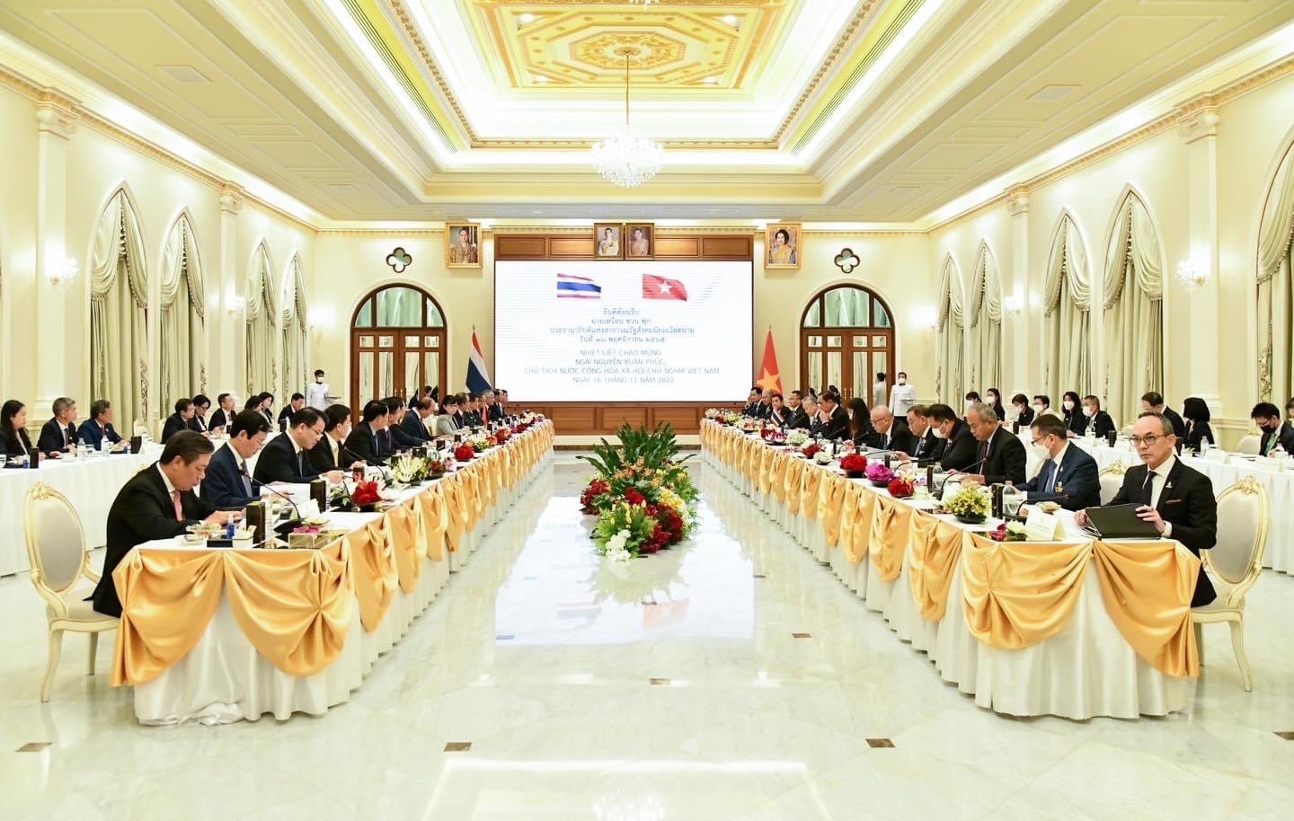 โดย นายกรัฐมนตรี กล่าวว่า เป็นเกียรติอย่างยิ่งที่ได้ต้อนรับประธานาธิบดีเวียดนาม ที่เยือนไทยอย่างเป็นทางการ ถือเป็นโอกาสพิเศษ ทั้งในฐานะเพื่อนเก่าที่ใกล้ชิดของตน ที่ได้ทำงานร่วมกันตั้งแต่สมัยดำรงตำแหน่งนายกรัฐมนตรีเวียดนาม และถือเป็นการเยือนไทยครั้งแรก ในระดับประมุข ในรอบ 24 ปี ซึ่งการเยือนครั้งนี้ เกิดขึ้นท่ามกลางความท้าทายทางการเมือง และความผันผวนทางเศรษฐกิจ ระหว่างประเทศ ขณะเดียวกันทุกประเทศได้ฟื้นฟูเศรษฐกิจ จากโควิด-19 จากการหารือร่วมกัน ในวันพรุ่งนี้จะหารือธุรกิจไทยเวียดนาม ที่จะมีนักธุรกิจชั้นนำสองประเทศ กว่า 300 คน เพื่อขับเคลื่อน เร่งฟื้นฟูเศรษฐกิจของทั้งสองประเทศ ให้เป็นหุ้นส่วนยุทธศาสตร์ระหว่างกัน ฉลองครอบรอบ 10 ปี หุ้นส่วนยุทธศาตร์ไทยเวียดนาม ขณะเดียวกัน จะมีการเปิดใช้งานคิวอาร์โค้ท เพื่ออำนวยความสะดวกการค้าขายระหว่างกัน พร้อมตั้งเป้าเพิ่มมูลค่าการค้าระหว่างกัน เป็น 25,000 ล้านเหรียญสหรัฐฯ ภายในปี 2025 ตามแนวทาง Three Connects ใน 3 ด้าน คือ