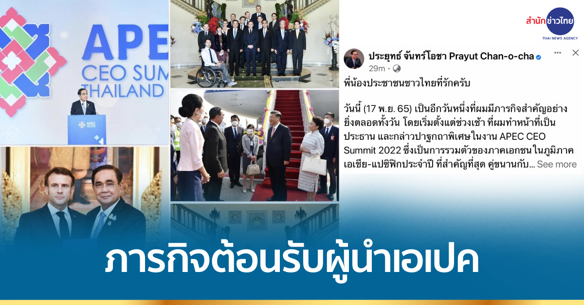กทม. 17 พ.ย. – นายกฯ โพสต์เฟซบุ๊กภารกิจสำคัญต้อนรับผู้นำต่างประเทศร่วมประชุมเอเปค ย้ำได้รับประโยชน์รอบด้าน คาดเงินสะพัดในระบบเศรษฐกิจไทย 20,000 ล้านบาท
