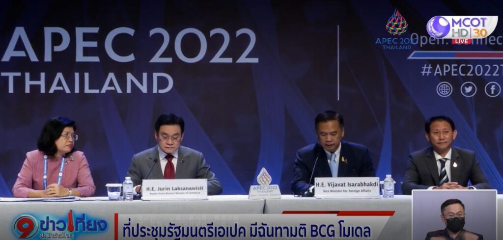 ด้านนายจุรินทร์ ลักษณวิศิษฏ์ รัฐมนตรีว่าการกระทรวงพาณิชย์ เปิดเผยว่า ที่ประชุมรัฐมนตรีเอเปคมีฉันทามติเป้าหมายกรุงเทพฯ เศรษฐกิจ BCG เตรียมเสนอในระดับผู้นำเอเปค วันที่ 19 พ.ย.นี้ โดยที่ประชุมพร้อมขับเคลื่อนเขตการค้าเสรี FTA เอเปค ให้เกิดผลเป็นรูปธรรม โดยให้ WTO เป็นศูนย์กลาง เพื่อผลักดันพหุภาคี ซึ่งในโอกาสต่อไปจะร่วมกันหารือลดอุปสรรคด้านต่างๆ เพิ่มเติม
