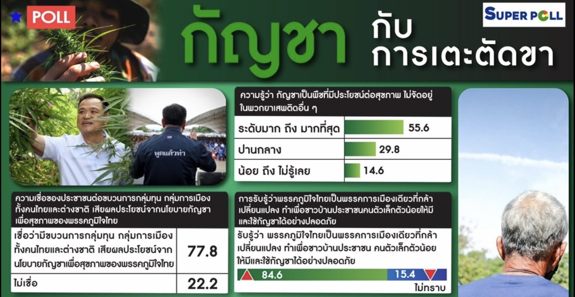 ผศ.ดร.นพดล กรรณิกา ผู้อำนวยการสำนักวิจัยซูเปอร์โพล (SUPER POLL) รเปิดเผยว่า ตนได้ร่วมกับ นางจุฬารัตน์ นิรัติศยกุล นักวิชาการอิสระด้านการเกษตรและการพัฒนาชนบท ดำเนินการสำรวจ เรื่อง กัญชา กับ การเตะตัดขา กรณีศึกษาประชาชนทุกสาขาอาชีพทั่วประเทศดำเนินโครงการจากผู้ถามผู้ตอบและเครื่องมือวัด จำนวน 1,226 ตัวอย่าง ระหว่างวันที่ 15 – 18 พฤศจิกายน พ.ศ. 2565 ที่ผ่านมา โดนพบว่า ส่วนใหญ่หรือร้อยละ 55.6 มีความรู้มากถึงมากที่สุดว่า กัญชาเป็นพืชที่มีประโยชน์ต่อสุขภาพไม่จัดอยู่ในพวกยาเสพติดอื่น ๆ ในขณะที่ ร้อยละ29.8 มีความรู้ระดับปานกลาง และร้อยละ 14.6 ระบุมีความรู้น้อยถึงไม่รู้เลย อย่างไรก็ตาม ส่วนใหญ่หรือร้อยละ 77.8 เชื่อว่ามีขบวนการกลุ่มทุน กลุ่มการเมืองทั้งคนไทยและต่างชาติ เสียผลประโยชน์จากนโยบายกัญชาเพื่อสุขภาพของพรรคภูมิใจไทย ในขณะที่ ร้อยละ 22.2 ไม่เชื่อ