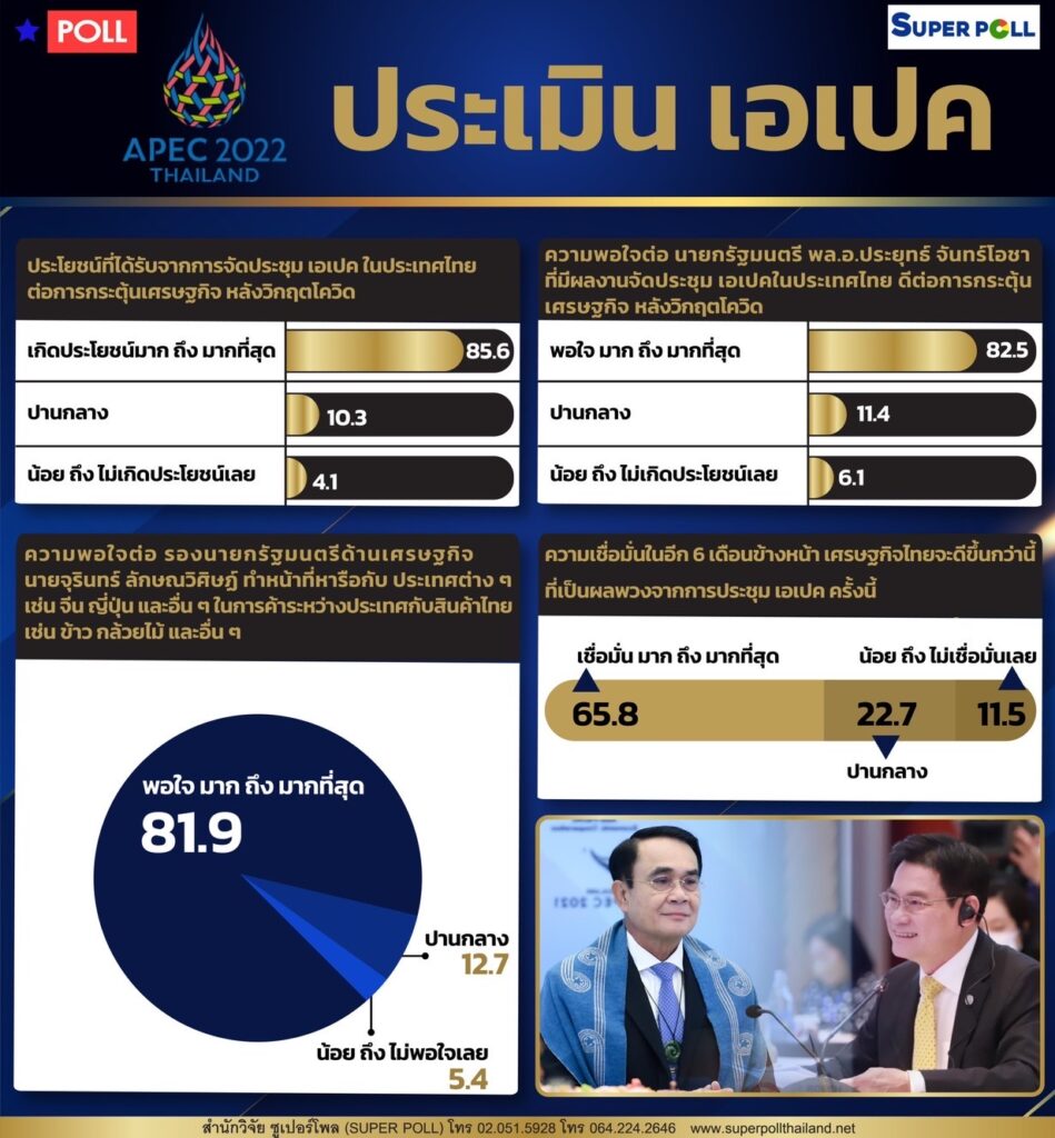 ผอ.ซูเปอร์โพล กล่าวว่า ผลโพลชิ้นนี้ชี้ให้เห็นว่า ประชาชนส่วนใหญ่พอใจต่อการจัดประชุมเอเปคในประเทศไทยและพอใจต่อ นายกรัฐมนตรี พล.อ.ประยุทธ์ จันทร์โอชาและนายจุรินทร์ ลักษณวิศิษฏ์ รองนายกรัฐมนตรีด้านเศรษฐกิจในการทำหน้าที่หารือกับต่างประเทศในด้านการค้าการลงทุนระหว่างประเทศโดยเฉพาะสินค้าทางการเกษตรด้วยการเปิดกว้างในทุกโอกาสสร้างความสมดุลในการเปลี่ยนแปลงหลังวิกฤตโควิด โดยเฉพาะการพัฒนาเศรษฐกิจในรูปแบบใหม่ที่กำลังเป็นกระแสตื่นตัวไปทั่วโลกด้วยโมเดลเศรษฐกิจจากฐานชีวภาพ (Bio Economy) เศรษฐกิจหมุนเวียน (Circular Economy) และเศรษฐกิจสีเขียว (Green Economy) ที่มุ่งเน้นไปยังการสร้างความสมดุลและเปิดทุกโอกาสในการปรับเปลี่ยนระบบเศรษฐกิจหลังวิกฤตโควิด