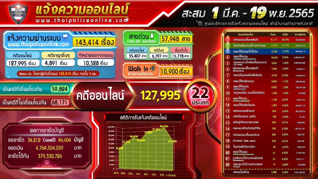 โดยในปี 2565 สำนักงานตำรวจแห่งชาติได้รับแจ้งความคดีออนไลน์ จำนวน 127,995 เรื่อง แบ่งเป็นคดีออนไลน์จำนวน 22 ประเภท โดยเป็นกรณีหลอกลวงซื้อขายสินค้าสูงสุดเป็นอันดับ 1 จำนวน 47,111 คดี การโอนเงินเพื่อหารายได้จากกิจกรรม จำนวน 17,364 คดี และการหลอกให้กู้เงินแต่ไม่ได้รับเงิน จำนวน 15,301 คดี