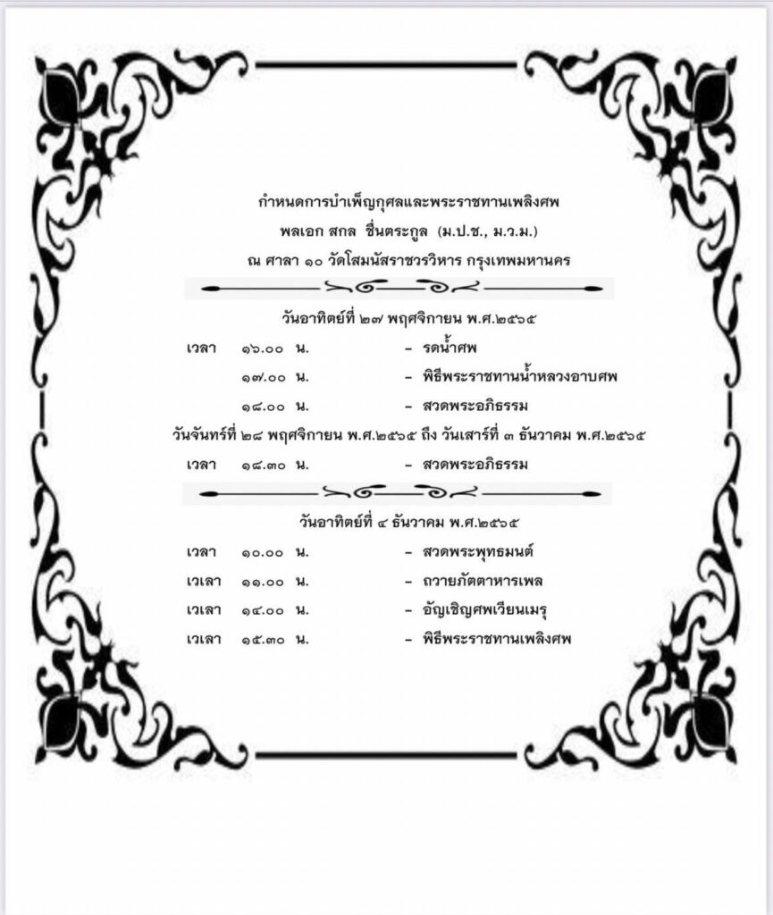 ทั้งนี้ การถึงแก่อนิจกรรมของ พลเอก สกล ชื่นตระกูล ทำให้จำนวนสมาชิกวุฒิสภา คงเหลืออยู่ขณะนี้ 248 คน โดยกำหนดการบำเพ็ญกุศลและพระราชทานเพลิงศพ ณ ศาลา 10 วัดโสมนัสราชวรวิหาร กรุงเทพมหานคร ดังนี้