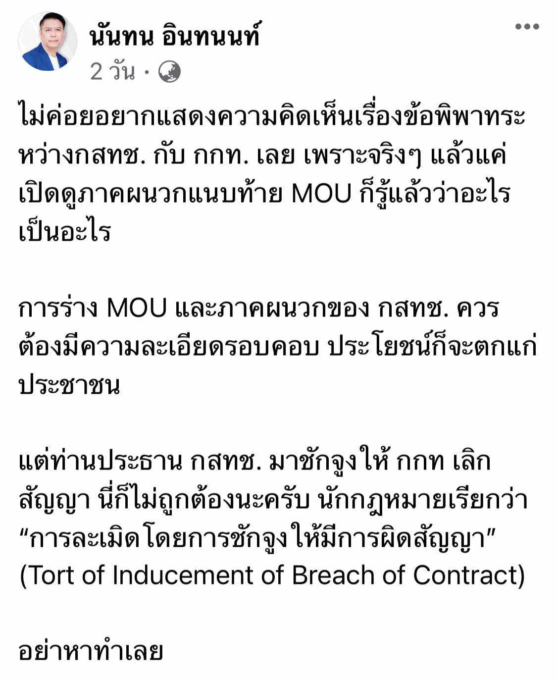 นายนันทน อินทนนท์ นักกฎหมายหุ้นส่วน สำนักงานกฎหมายระดับโลก ตีเลกี & กิบบินส์ เปิดเผยผ่านเฟสบุ๊ก “นันทน อินทนนท์” เกี่ยวกับปัญหาความวุ่นวายในการถ่ายทอดฟุตบอลโลกของไทย ซึ่งล่าสุด กสทช.มีมติให้เรียกเงินจำนวน 600 ล้านบาทคืนจากการกีฬาแห่งประเทศไทย หรือ กกท. เนื่องจากเห็นว่า กกท.ไม่ปฏิบัติตามข้อตกลงเอ็มโอยู โดยอ้างทำผิดกฎMust Carry เนื่องจากโทรทัศน์ระบบบอกรับสมาชิกไอพีทีวีไม่สามารถรับชมได้ โดย นพ.สรณบุญใบชัยพฤกษ์ ประธานบอร์ด กสทช. ได้เสนอทางแก้ปัญหาด้วยการขอให้ กกท.ยกเลิกเอ็มโอยูกับเอกชนและเปิดให้ไอพีทีวีถ่ายทอดการแข่งขันบอลโลก หรืออีกทางเลือกหรือคืนเงิน 600 ล้านบาท เพื่อที่จะได้ไม่ต้องต่อสู้กันในศาลปกครองฯ ในการนี้ นายนันทน ได้แสดงความเห็นบนเฟสบุ๊คของตนเองโดยระบุว่า “ไม่ค่อยอยากแสดงความคิดเห็นเรื่องข้อพิพาทระหว่างกสทช. กับ กกท. เลย เพราะจริง ๆ แล้วแค่เปิดดูภาคผนวกแนบท้าย MOU ก็รู้แล้วว่าอะไรเป็นอะไร การร่าง MOU และภาคผนวกของ กสทช. ควรต้องมีความละเอียดรอบคอบ ประโยชน์ก็จะตกแก่ประชาชน แต่ท่าน กสทช. มาชักจูงให้ กกท. เลิกสัญญา นี่ก็ไม่ถูกต้องนะครับ นักกฎหมายเรียกว่า “การละเมิดโดยการชักจูงให้มีการผิดสัญญา” (Tort of Inducement of Breach of Contract) อย่าหาทำเลย”
