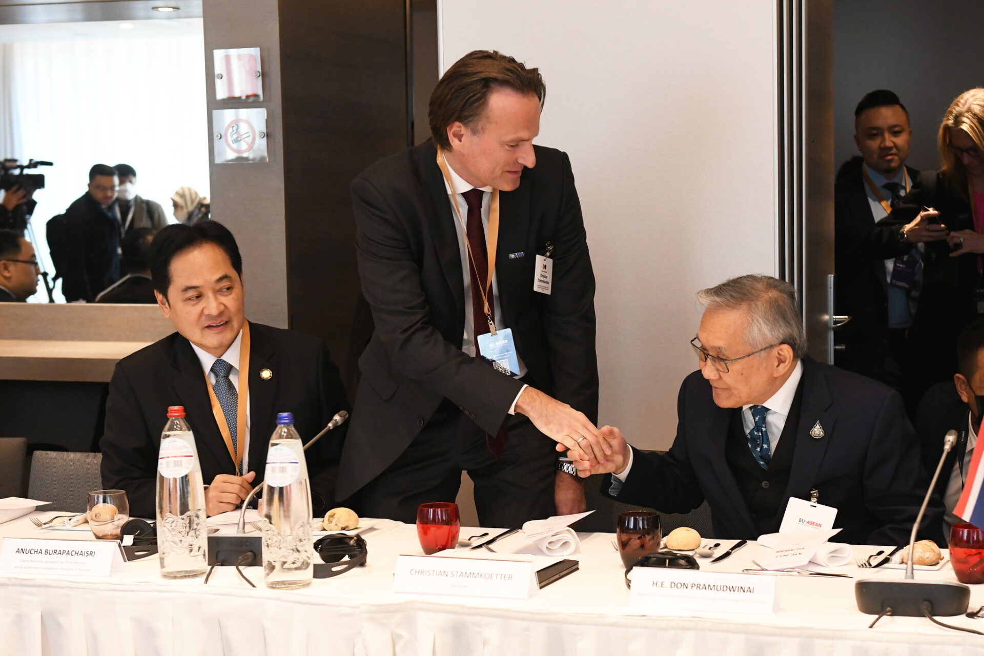 นายกรัฐมนตรีกล่าวแสดงความยินดีที่ได้พบกับผู้บริหารของสหภาพยุโรปและผู้บริหารจากภาคเอกชนชั้นนำของยุโรป เพื่อรับฟังข้อเสนอแนะ และแลกเปลี่ยนข้อคิดเห็นในการส่งเสริมการค้า การลงทุน ระหว่างภูมิภาคอาเซียน-ยุโรป และฟื้นฟูเศรษฐกิจภายหลังโควิด-19 อย่างยั่งยืน ทั้งนี้ บริบทโลกในปัจจุบันกำลังเผชิญกับความท้าทายในหลายมิติ สะท้อนถึงความจำเป็นที่ทุกฝ่ายจะต้องเร่งดำเนินการเพื่อส่งเสริมความยั่งยืนในทุกมิติ โดยเน้นความสมดุล