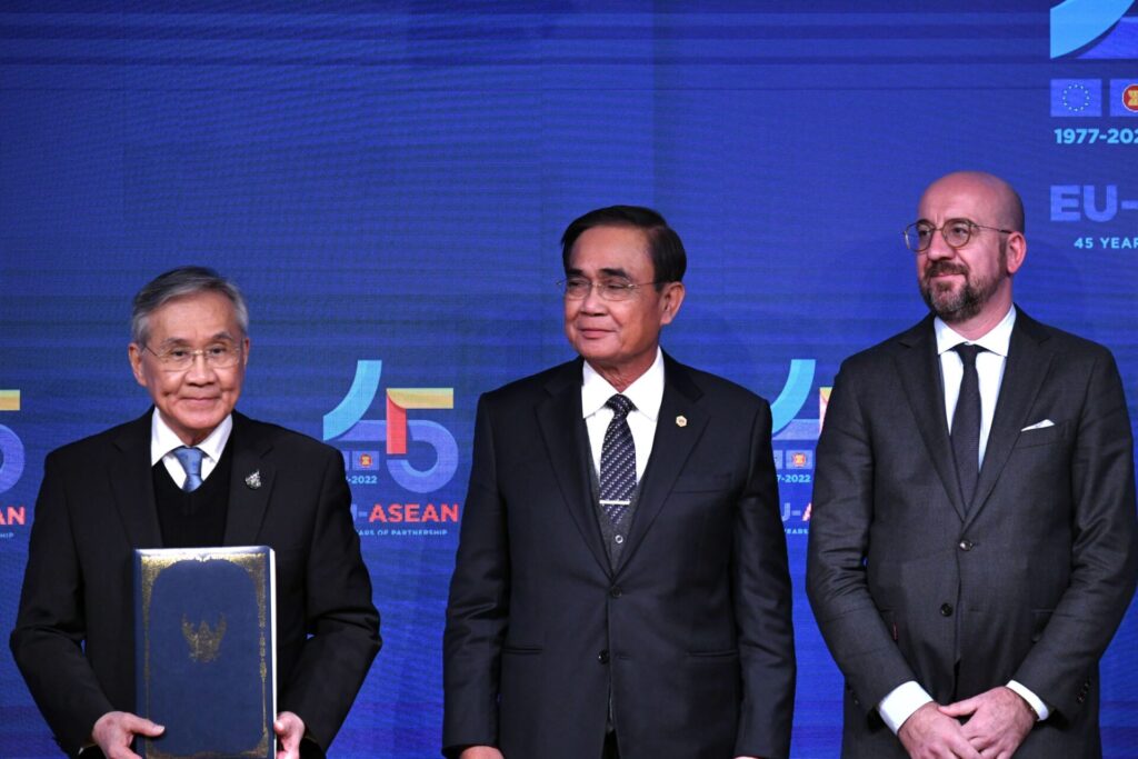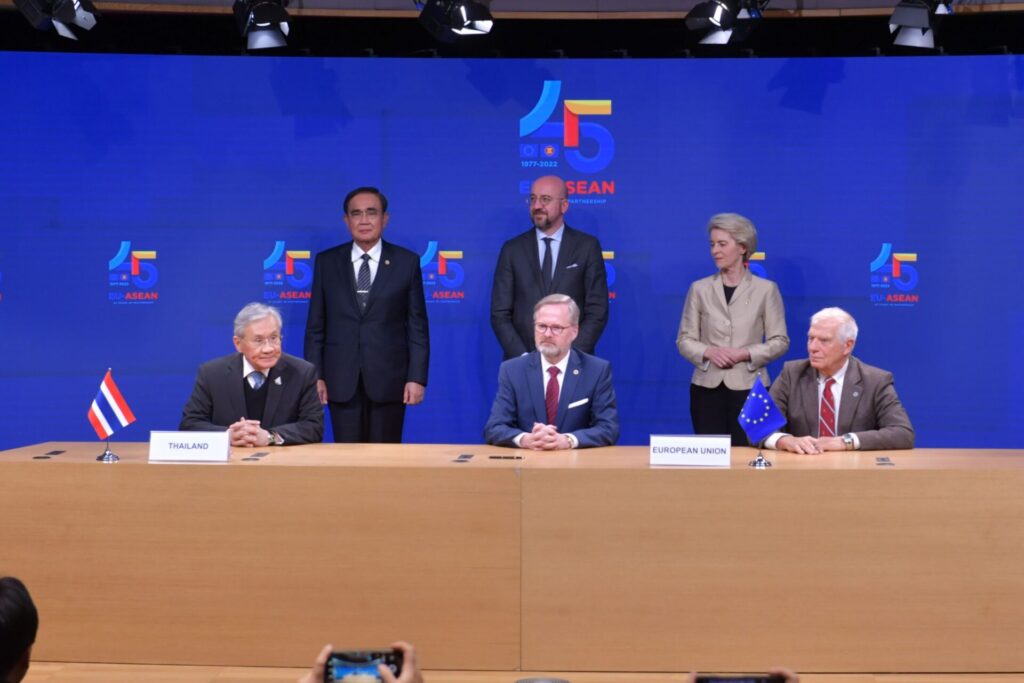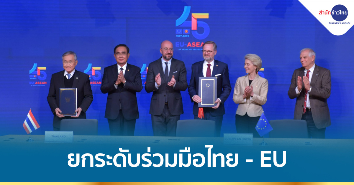 “เพ็ญพร พิพัฒโนทัย” ผู้สื่อข่าวสำนักข่าวไทย ติดตามการประชุมสุดยอดอาเซียน-สหภาพยุโรป สมัยพิเศษ เพื่อฉลองวาระครบรอบ 45 ปี ความสัมพันธ์อาเซียน-สหภาพยุโรป ของพล.อ.ประยุทธ์ จันทร์โอชา นายกรัฐมนตรีและรัฐมนตรีว่าการกระทรวงกลาโหมที่กรุงบรัสเซลส์ ราชอาณาจักรเบลเยียม ระหว่างวันที่ 12 – 15 ธันวาคม 2565 รายงานว่า วันนี้ (14 ธ.ค.) เวลา 16.15 น. ตามเวลาท้องถิ่น ซึ่งช้ากว่าประเทศไทย 6 ชั่วโมง พลเอก ประยุทธ์ จันทร์โอชา นายกรัฐมนตรีและรัฐมนตรีว่าการกระทรวงกลาโหม พร้อมด้วย นายดอน ปรมัตถ์วินัย รองนายกรัฐมนตรีและรัฐมนตรีว่าการกระทรวงการต่างประเทศ และผู้นำฝ่ายสหภาพยุโรป ได้แก่ นายชาร์ล มิเชล ประธานคณะมนตรียุโรป นางอัวร์ซูลา ฟ็อน แดร์ ไลเอิน ประธานคณะกรรมาธิการยุโรป นายเป็ตร์ ฟียาลา นายกรัฐมนตรีเช็ก ในฐานะประธานคณะมนตรีแห่งสหภาพยุโรป และนาย Josep Borrell Fontelles รองประธานคณะกรรมาธิการยุโรปและผู้แทนระดับสูงของสหภาพยุโรป ด้านการต่างประเทศและนโยบายความมั่นคง ร่วมในพิธีลงนามร่างกรอบความตกลงว่าด้วยความเป็นหุ้นส่วนและความร่วมมือรอบด้านระหว่างสหภาพยุโรปและรัฐสมาชิกฝ่ายหนึ่งกับราชอาณาจักรไทยอีกฝ่ายหนึ่ง (Framework Agreement on Comprehensive Partnership and Cooperation between the European Union and its Member States, of the one part, and the Kingdom of Thailand, of the other part) หรือ PCA EU-Thai