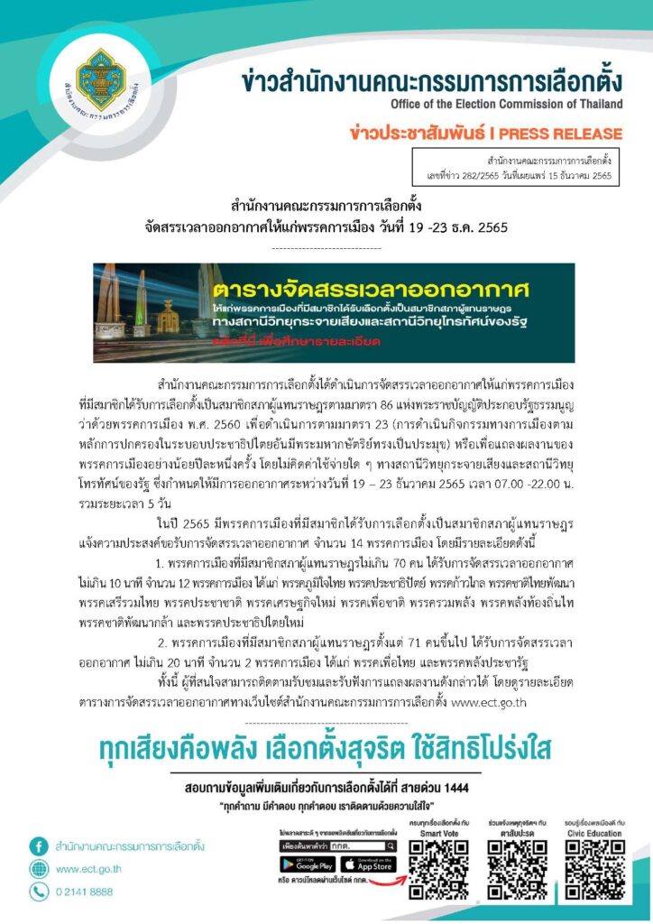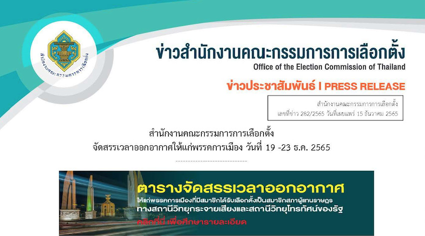 สำนักงาน กกต.แจ้งว่า สำนักงานฯ ได้ดำเนินการจัดสรรเวลาออกอากาศให้แก่พรรคการเมืองที่มีสมาชิกได้รับการเลือกตั้งเป็นสมาชิกสภาผู้แทนราษฎรตามมาตรา 86 พ.ร.ป.ว่าด้วยพรรคการเมือง พ.ศ. 2560 เพื่อดำเนินการตามมาตรา 23 การดำเนินกิจกรรมทางการเมืองตามหลักการปกครองในระบอบประชาธิปไตยอันมีพระมหากษัตริย์ทรงเป็นประมุข) หรือเพื่อแถลงผลงานของพรรคการเมืองอย่างน้อยปีละหนึ่งครั้ง โดยไม่คิดค่าใช้จ่ายใด ๆ ทางสถานีวิทยุกระจายเสียงและสถานีวิทยุโทรทัศน์ของรัฐ ซึ่งกำหนดให้มีการออกอากาศระหว่างวันที่ 19 – 23 ธ.ค.65 เวลา 07.00 -22.00 น. รวมระยะเวลา 5 วัน