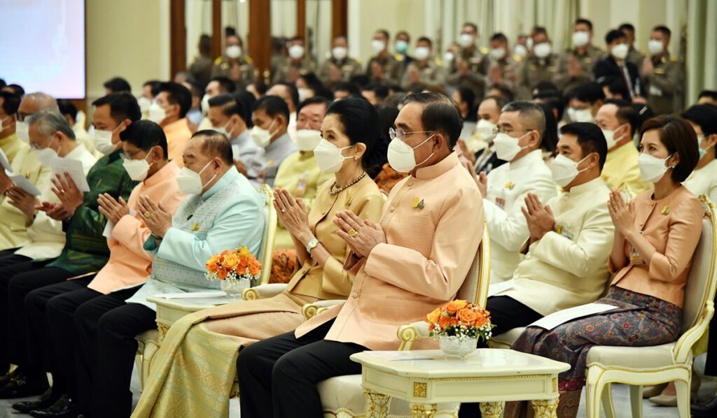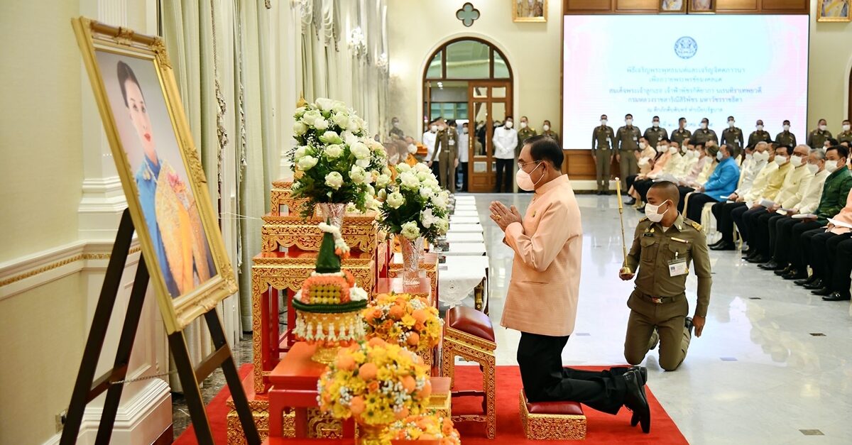 เมื่อนายกรัฐมนตรีและภริยาเดินทางถึงตึกภักดีบดินทร์ พระสงฆ์ จำนวน 10 รูป ขึ้นนั่งอาสนะสงฆ์ นายกรัฐมนตรีจุดเทียนบูชาพระรัตนตรัย ถวายธูปเทียนแพ หน้าพระรูปสมเด็จพระเจ้าลูกเธอ เจ้าฟ้าพัชรกิติยาภา นเรนทิราเทพยวดี กรมหลวงราชสาริณีสิริพัชร มหาวัชรราชธิดา เจ้าหน้าที่อาราธนาศีล พระสงฆ์ให้ศีลและเจริญพระพุทธมนต์ จากนั้น นายกรัฐมนตรีถวายผ้าไตรพระสงฆ์ จำนวน 10 รูป นายกรัฐมนตรีและภริยา พร้อมด้วยคณะรัฐมนตรีและคู่สมรส ถวายเครื่องไทยธรรม พระสงฆ์สวดอนุโมทนา นายกรัฐมนตรีกรวดน้ำรับพร กราบลาพระรัตนตรัย ถวายความเคารพหน้าพระรูปสมเด็จพระเจ้าลูกเธอ เจ้าฟ้าพัชรกิติยาภา นเรนทิราเทพยวดี กรมหลวงราชสาริณีสิริพัชร มหาวัชรราชธิดา เสร็จพิธี. สำนักข่าวไทย