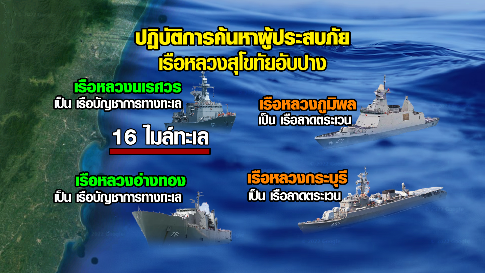 ประจวบคีรีขันธ์ 21 ธ.ค. – ทร.จัดอากาศยานไร้คนขับ (UAV) ปูพรมค้นหากำลังพล “เรือหลวงสุโขทัย” 23 นาย ที่ยังสูญหาย ขณะที่เมื่อคืนนี้ เฮลิคอปเตอร์ลำเลียงร่างกำลังพล 5 นาย ที่เสียชีวิต ขึ้นฝั่งบางสะพาน เพื่อชันสูตร-พิสูจน์อัตลักษณ์บุคคล