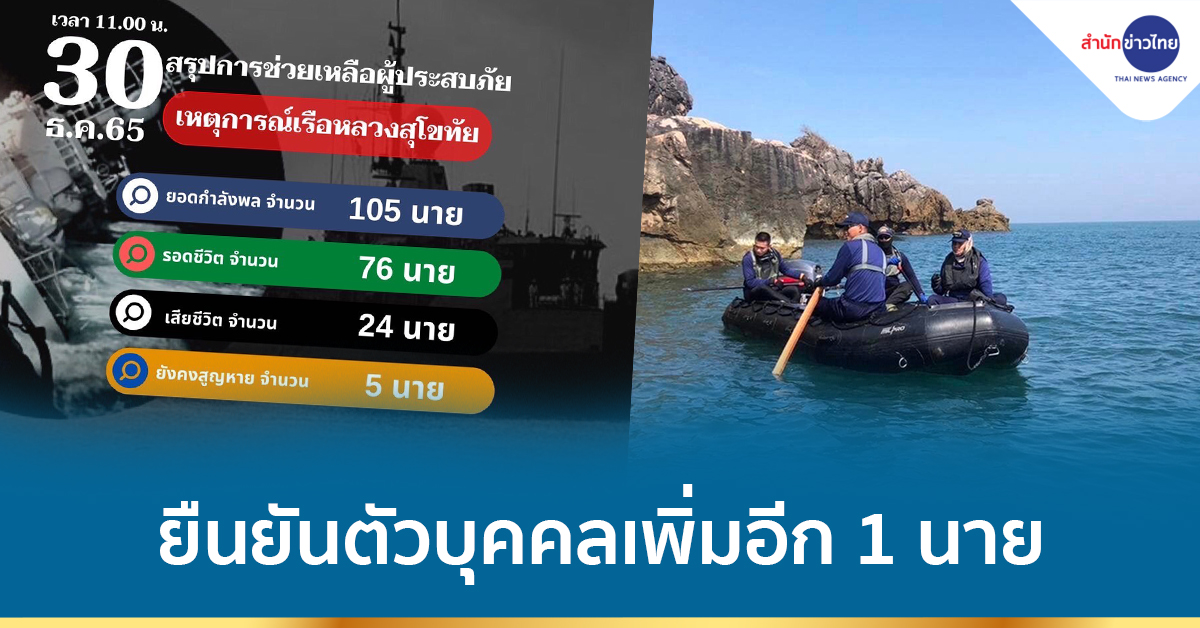 วันนี้ 30 ธันวาคม 2565 เวลา 11.00 น.พลเรือเอก ปกครอง มนธาตุผลิน โฆษกกองทัพเรือ เปิดเผยว่า ในวันนี้กองทัพเรือยังคงดำเนินการ เร่งค้นหาและช่วยเหลือกำลังพล กรณีเรือหลวงสุโขทัยอับปาง ในพื้นที่ลาดตระเวนตามแผน ทั้ง 17 พื้นที่ รวมถึงพื้นที่ตามแนวชายฝั่ง โดยวันนี้จะเข้าสำรวจเกาะลังกาจิว และเกาะง่ามใหญ่ จังหวัดชุมพร นอกจากนั้น ในส่วนของกรมสรรพาวุธทหารเรือ และหน่วยบัญชาการสงครามพิเศษทางเรือ กองเรือยุทธการ จะทำการสำรวจใต้น้ำบริเวณแหลมคอกวาง และพื้นที่ก้นอ่าว จังหวัดชุมพร ผลการปฏิบัติจนถึงขณะนี้ (วันที่ 30 ธันวาคม 2565 เวลา 11.00 น.) ยังไม่มีการพบผู้สูญหายเพิ่ม และในขณะนี้สามารถยืนยันตัวบุคคลจากผลพิสูจน์เอกลักษณ์บุคคล ได้เพิ่มอีก 1นาย จากที่ได้ส่งพิสูจน์ 2 นาย ยืนยันว่าคือ จ่าเอก ไพร ร่วมญาติ คงเหลือร่างที่รอพิสูจน์เอกลักษณ์บุคคลจำนวน 1 นาย