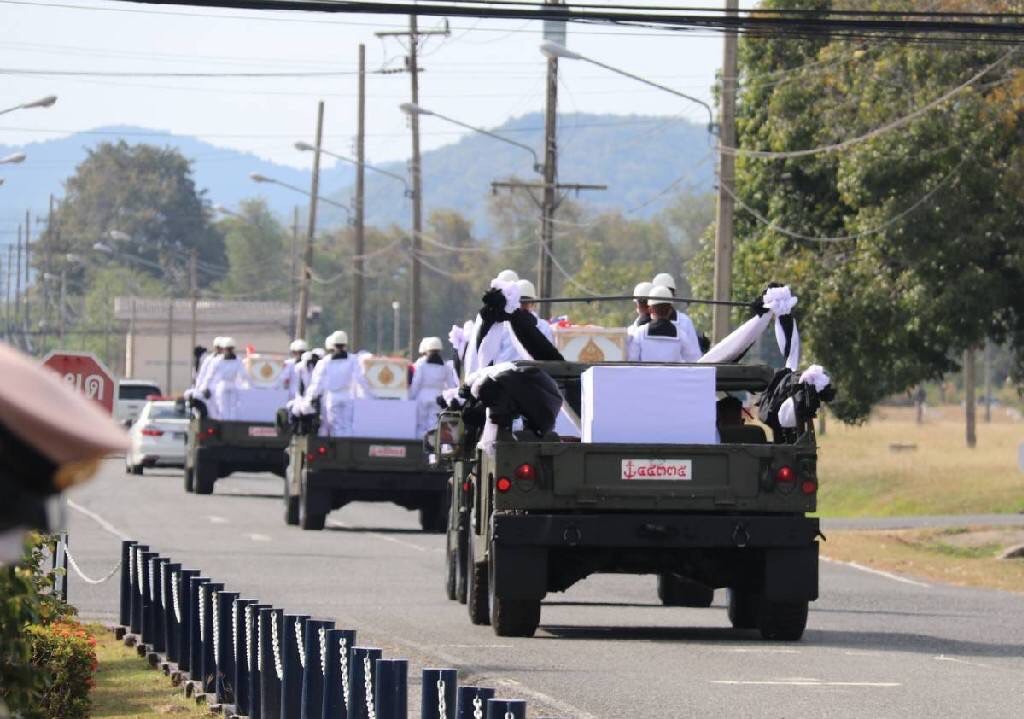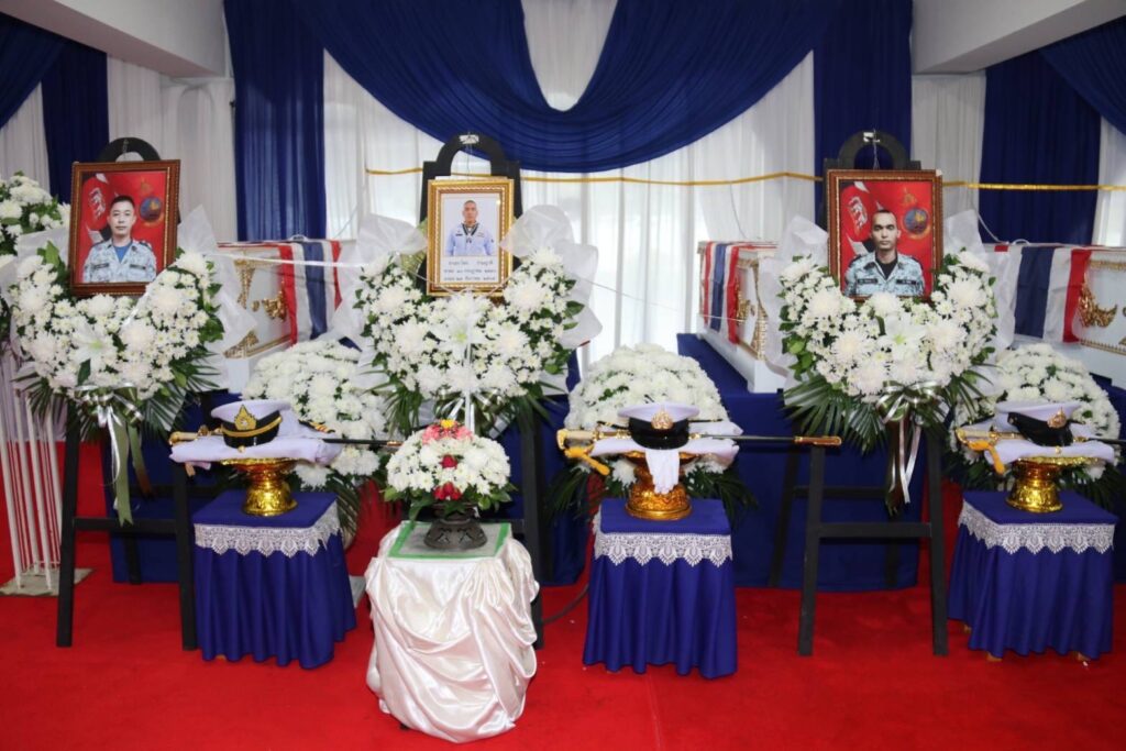 จากนั้นได้มีการเคลื่อนร่างไปยังฌาปนสถานกองทัพเรือสัตหีบ อำเภอสัตหีบ จังหวัดชลบุรี โดยมีทหารกองเกียรติยศรับรถขบวนเคลื่อนย้ายร่าง ตลอดเส้นทางผ่านอย่างสมเกียรติ ซึ่งผู้เสียชีวิตทั้ง 3 นาย ได้รับพระมหากรุณาธิคุณโปรดเกล้าโปรดกระหม่อม จากพระบาทสมเด็จพระเจ้าอยู่หัว ให้ศพอยู่ในพระบรมราชานุเคราะห์ โดยตั้งบำเพ็ญกุศล ฯ ณ ฌาปนสถานกองทัพเรือ สัตหีบ และในเวลา 17.00 น พระบาทสมเด็จพระเจ้าอยู่หัว ทรงพระกรุณาโปรดเกล้าฯ พระราชทานน้ำหลวงอาบศพ และพวงมาลาพระราชทาน วางหน้าหีบศพกำลังพลที่เสียชีวิตทั้ง 3 นาย .-สำนักข่าวไทย