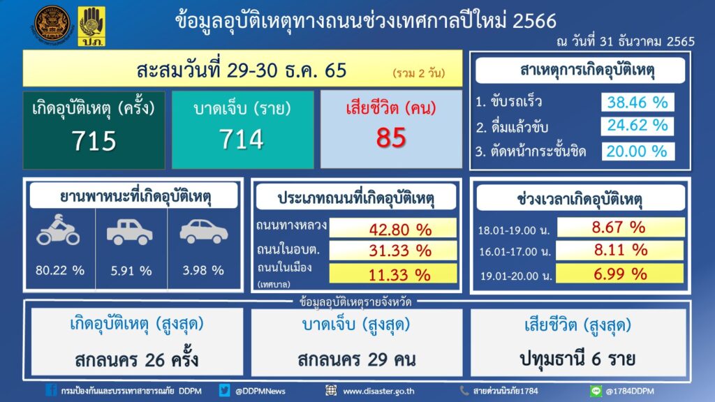 สรุปอุบัติเหตุทางถนนสะสมในช่วง 2 วันของการรณรงค์ (29-30 ธ.ค.65) เกิดอุบัติเหตุ รวม 715 ครั้ง ผู้บาดเจ็บรวม 714 ราย ผู้เสียชีวิต รวม 85 ราย จังหวัดที่ไม่มีผู้เสียชีวิต (ตายเป็นศูนย์) มี 31 จังหวัด ซึ่ง ศปถ. ได้ประสานจังหวัดเพิ่มความเข้มข้นจัดตั้งจุดตรวจในถนนทางหลวง เส้นทางสายรอง ถนน อบต.และหมู่บ้าน กวดขันดื่มแล้วขับ ขับรถเร็ว ไม่สวมหมวกนิรภัย และรถจักรยนต์ไม่ปลอดภัย รวมถึงดูแลความปลอดภัยบริเวณสถานที่จัดงานเทศกาลปีใหม่ เพื่อสร้างความปลอดภัยมอบเป็นของขวัญปีใหม่แก่ประชาชน
