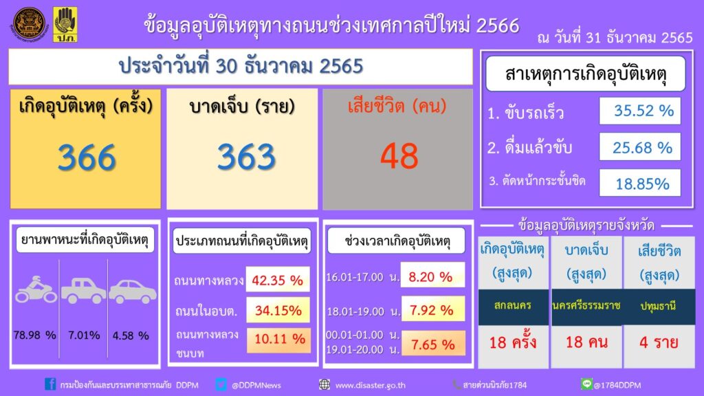 ศูนย์อำนวยการป้องกันและลดอุบัติเหตุทางถนนช่วงเทศกาลปีใหม่ พ.ศ.2566 สรุปสถิติอุบัติเหตุทางถนนประจำวันที่ 30 ธันวาคม 2565 เกิดอุบัติเหตุ 366 ครั้ง ผู้บาดเจ็บ 363 คน ผู้เสียชีวิต 48 ราย