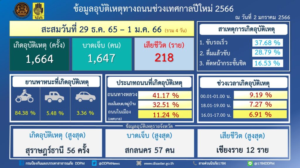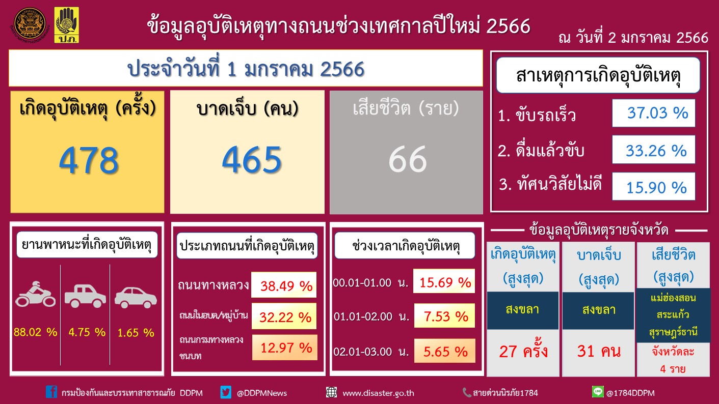 นายบุญธรรม เลิศสุขีเกษม อธิบดีกรมป้องกันและบรรเทาสาธารณภัย (ปภ.) เลขานุการศูนย์อำนวยการความปลอดภัยทางถนน (ศปถ.) ในฐานะประธานการประชุมคณะอนุกรรมการเฉพาะกิจศูนย์อำนวยการป้องกันและลดอุบัติเหตุทางถนนตลอดทั้งปี เปิดเผยว่า ศูนย์อำนวยการป้องกันและลดอุบัติเหตุทางถนนช่วงเทศกาลปีใหม่ พ.ศ. 2566 โดยกรมป้องกันและบรรเทาสาธารณภัยและความร่วมมือของหน่วยงานภาคีเครือข่ายได้รวบรวมสถิติอุบัติเหตุทางถนนประจำวันที่ 1 มกราคม 2566 ซึ่งเป็นวันที่สี่ของการรณรงค์ “ชีวิตวิถีใหม่ ขับขี่อย่างปลอดภัย ไร้อุบัติเหตุ” เกิดอุบัติเหตุ 478 ครั้ง ผู้บาดเจ็บ 465 คน ผู้เสียชีวิต 66 ราย สาเหตุที่ทำให้เกิดอุบัติเหตุสูงสุด ได้แก่ ขับรถเร็ว ร้อยละ 37.03 ดื่มแล้วขับ ร้อยละ 33.26 ยานพาหนะที่เกิดอุบัติเหตุสูงสุด ได้แก่ รถจักรยานยนต์ ร้อยละ 88.02 ส่วนใหญ่เกิดบนเส้นทางตรง ร้อยละ 79.50 ถนนกรมทางหลวง ร้อยละ 38.49 ถนนใน อบต./หมู่บ้านร้อยละ 32.22 ช่วงเวลาที่เกิดอุบัติเหตุสูงสุด ได้แก่ ช่วงเวลา 00.01-01.00 น. ร้อยละ 15.69 ผู้บาดเจ็บและเสียชีวิตสูงสุดอยู่ในช่วงอายุ 20 – 29 ปี ร้อยละ 23.54 มีการจัดตั้งจุดตรวจหลัก 1,887 จุด เจ้าหน้าที่ปฏิบัติงาน 55,851 คน เรียกตรวจยานพาหนะ 401,164 คัน มีผู้ถูกดำเนินคดีรวม 59,862 ราย มีความผิดฐานไม่มีใบขับขี่ 16,696 ราย ไม่สวมหมวกนิรภัย 16,070 ราย ขับรถเร็วเกินกำหนด 7,109 ราย โดยจังหวัดที่เกิดอุบัติเหตุสูงสุด ได้แก่ สงขลา (27 ครั้ง) จังหวัดที่มีผู้บาดเจ็บสูงสุด ได้แก่ สงขลา (31 คน) จังหวัดที่มีผู้เสียชีวิตสูงสุด ได้แก่ แม่ฮ่องสอน สระแก้ว สุราษฎร์ธานี (จังหวัดละ 4 ราย)