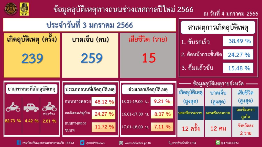 นายโชตินรินทร์ เกิดสม รองปลัดกระทรวงมหาดไทย ในฐานะประธานการประชุมคณะอนุกรรมการเฉพาะกิจศูนย์อำนวยการป้องกันและลดอุบัติเหตุทางถนนตลอดทั้งปี เปิดเผยว่า ศูนย์อำนวยการป้องกันและลดอุบัติเหตุทางถนนช่วงเทศกาลปีใหม่ พ.ศ. 2566 โดยกรมป้องกันและบรรเทาสาธารณภัยและความร่วมมือของหน่วยงานภาคีเครือข่ายได้รวบรวมสถิติอุบัติเหตุทางถนนประจำวันที่ 3 มกราคม 2566 ซึ่งเป็นวันที่6 ของการรณรงค์ “ชีวิตวิถีใหม่ ขับขี่อย่างปลอดภัย ไร้อุบัติเหตุ” เกิดอุบัติเหตุ 239 ครั้ง ผู้บาดเจ็บ 259 คน ผู้เสียชีวิต 15 ราย สาเหตุที่ทำให้เกิดอุบัติเหตุสูงสุด ได้แก่ ขับรถเร็ว ร้อยละ 38.49 ตัดหน้ากระชั้นชิด ร้อยละ 24.27 ดื่มแล้วขับ ร้อยละ 15.48 ยานพาหนะที่เกิดอุบัติเหตุสูงสุด ได้แก่ รถจักรยานยนต์ ร้อยละ 82.73 ส่วนใหญ่เกิดบนเส้นทางตรง ร้อยละ 86.61 ถนนกรมทางหลวง ร้อยละ 48.12 ถนนใน อบต./หมู่บ้านร้อยละ 24.27 ช่วงเวลาที่เกิดอุบัติเหตุสูงสุด ได้แก่ ช่วงเวลา 18.01 – 19.00 น. ร้อยละ 9.21 ผู้บาดเจ็บและเสียชีวิตสูงสุดอยู่ในช่วงอายุ 40 – 49 ปี ร้อยละ 16.79 มีการจัดตั้งจุดตรวจหลัก 1,880 จุด เจ้าหน้าที่ปฏิบัติงาน 55,787 คน เรียกตรวจยานพาหนะ 365,238 คัน มีผู้ถูกดำเนินคดีรวม 54,629 ราย มีความผิดฐานไม่สวมหมวกนิรภัย 15,873 ราย ไม่มีใบขับขี่ 15,494 ราย ขับรถเร็วเกินกำหนด 7,384 ราย โดยจังหวัดที่เกิดอุบัติเหตุสูงสุด ได้แก่ นครศรีธรรมราช (12 ครั้ง) จังหวัดที่มีผู้บาดเจ็บสูงสุด ได้แก่ นครศรีธรรมราช (12 คน) จังหวัดที่มีผู้เสียชีวิตสูงสุด ได้แก่ ฉะเชิงเทรา และภูเก็ต (จังหวัดละ 2 ราย)