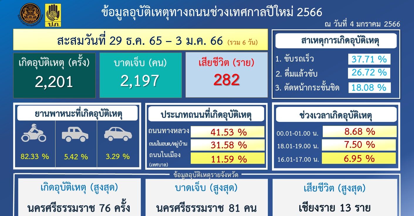 สรุปอุบัติเหตุทางถนนสะสมในช่วง 6 วันของการรณรงค์ (29 ธ.ค.65 – 3 ม.ค.66) เกิดอุบัติเหตุรวม 2,201 ครั้ง ผู้บาดเจ็บรวม 2,197 คน ผู้เสียชีวิตรวม 282 ราย จังหวัดที่เกิดอุบัติเหตุสะสมสูงสุด ได้แก่ นครศรีธรรมราช (76 ครั้ง) จังหวัดที่มีผู้บาดเจ็บสะสมสูงสุด ได้แก่ นครศรีธรรมราช (81 คน) จังหวัดที่มีผู้เสียชีวิตสะสมสูงสุด ได้แก่ เชียงราย (13 ราย) กรุงเทพมหานครและปทุมธานี (จังหวัดละ 11 ราย) จังหวัดที่ไม่มีผู้เสียชีวิต (ตายเป็นศูนย์) มี 6 จังหวัด ได้แก่ นราธิวาส บึงกาฬ พังงา ยะลา สตูล และสุโขทัย