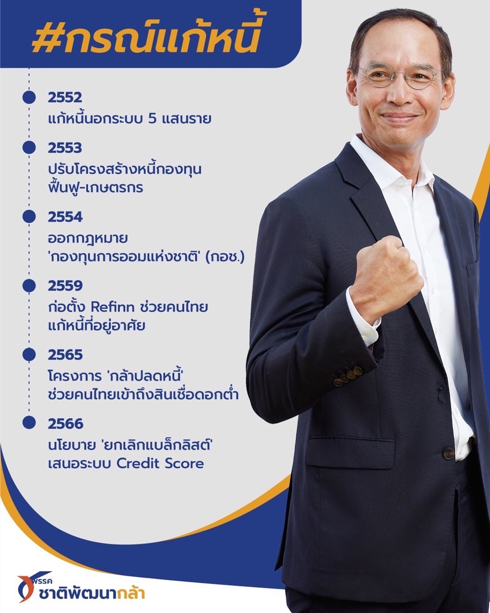 กรุงเทพฯ 7 ม.ค. – “กรณ์” ผุดโครงการแก้หนี้ เตรียมชงนโยบาย “ชาติพัฒนากล้า” รื้อโครงการระบบการเงิน-บูโร ช่วยคนไทย ปูพรมขึ้นป้าย “ยกเลิกแบล็กลิสต์ รื้อระบบสินเชื่อ” ทั่วประเทศ