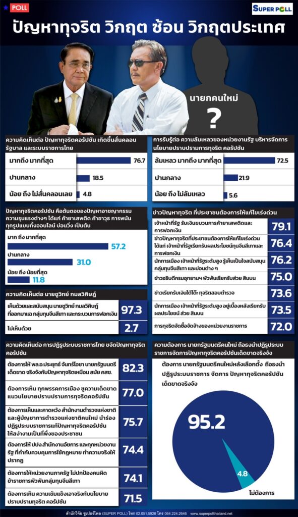 ผศ.ดร.นพดล กรรณิกา ผู้อำนวยการสำนักวิจัยซูเปอร์โพล (SUPER POLL) เปิดเผยผลสำรวจเรื่อง “ปัญหาทุจริต วิกฤติซ้อนวิกฤติประเทศ”กรณีศึกษาประชาชนทุกสาขาอาชีพทั่วประเทศ จำนวน 1,020 ตัวอย่าง ระหว่างวันที่ 5-7 มกราคม 2566 ที่ผ่านมา โดยมีประเด็นน่าเป็นห่วงคือ ส่วนใหญ่หรือร้อยละ 76.7 ระบุ ปัญหาทุจริตคอร์รัปชัน เกิดขึ้นสั่นคลอนรัฐบาล และระบบราชการไทยอย่างมาก ถึง มากที่สุด ในขณะที่ร้อยละ 18.5 ระบุปานกลาง และร้อยละ 4.8 ระบุน้อยถึงไม่สั่นคลอนเลย นอกจากนี้ ส่วนใหญ่หรือร้อยละ 72.5 ระบุ การรับรู้ต่อ ความล้มเหลวของหน่วยงานรัฐบริหารจัดการนโยบายปราบปรามการทุจริตคอรัปชัน ล้มเหลวมากถึงมากที่สุด ในขณะที่ร้อยละ 21.9 ระบุปานกลาง และร้อยละ 5.6 ระบุน้อยถึงไม่ล้มเหลว