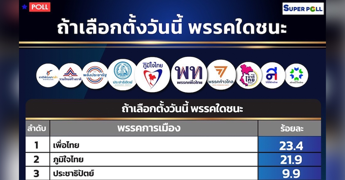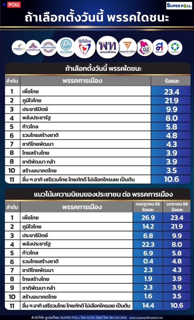 ผศ.ดร.นพดล กรรณิกา ผู้อำนวยการสำนักวิจัยซูเปอร์โพล (SUPER POLL) เสนอผลสำรวจ เรื่อง “ถ้าเลือกตั้งวันนี้ พรรคใดชนะ” กรณีศึกษาประชาชนทุกสาขาอาชีพทั่วประเทศ จำนวน 1,114 ตัวอย่าง ระหว่างวันที่ 2 – 7 มกราคม พ.ศ. 2566 ที่ผ่านมา โดยพบว่า ผู้ตอบแบบสอบถาม หญิง ร้อยละ 54.8 ชายร้อยละ 45.2 โดยผู้ตอบแบบสอบถาม ร้อยละ 51.4 อายุระหว่าง 25 – 39 ปี ร้อยละ 22.5 อายุไม่เกิน 24 ปี ร้อยละ 20.4 อายุระหว่าง 40 – 59 ปี และร้อยละ 5.7 อายุ 60 ปีขึ้นไป เมื่อถามถึงอาชีพ พบว่า 34.5 เป็นพนักงานบริษัทเอกชน ร้อยละ 23.2 ค้าขายส่วนตัว อาชีพอิสระ ร้อยละ 15.5 รับจ้างทั่วไป ร้อยละ 11.4 เกษตรกร ร้อยละ 7.4 นักเรียนนักศึกษา ร้อยละ 3.8 ข้าราชการ รัฐวิสาหกิจ ร้อยละ 2.2 เกษียณอายุ และ ร้อยละ 2.0 ว่างงาน เมื่อถามถึงระดับการศึกษา พบว่า ร้อยละ 51.7 ต่ำกว่าปริญญาตรี ร้อยละ 46.4 ปริญญาตรีและร้อยละ 1.9 สูงกว่าปริญญาตรี เมื่อถามถึงรายได้ พบว่า ร้อยละ 51.1 รายได้ระหว่าง 10,001 – 15,000 บาทต่อเดือน ร้อยละ 27.2 รายได้ 15,001 – 30,000 บาทต่อเดือน ร้อยละ 16.2 รายได้ต่ำกว่า 10,000 บาทต่อเดือน และร้อยละ 5.5 รายได้มากกว่า 30,000 บาทต่อเดือน นอกจากนี้ เมื่อถามถึงภาคที่มีสิทธิเลือกตั้ง พบว่า ร้อยละ 30.3 เลือกตั้งในภาคอีสาน ร้อยละ 26.9 เลือกตั้งในภาคกลาง ร้อยละ 17.8 เลือกตั้งในภาคเหนือ ร้อยละ 16.2 เลือกตั้งในภาคใต้ และร้อยละ 8.8 เลือกตั้งในกรุงเทพมหานคร