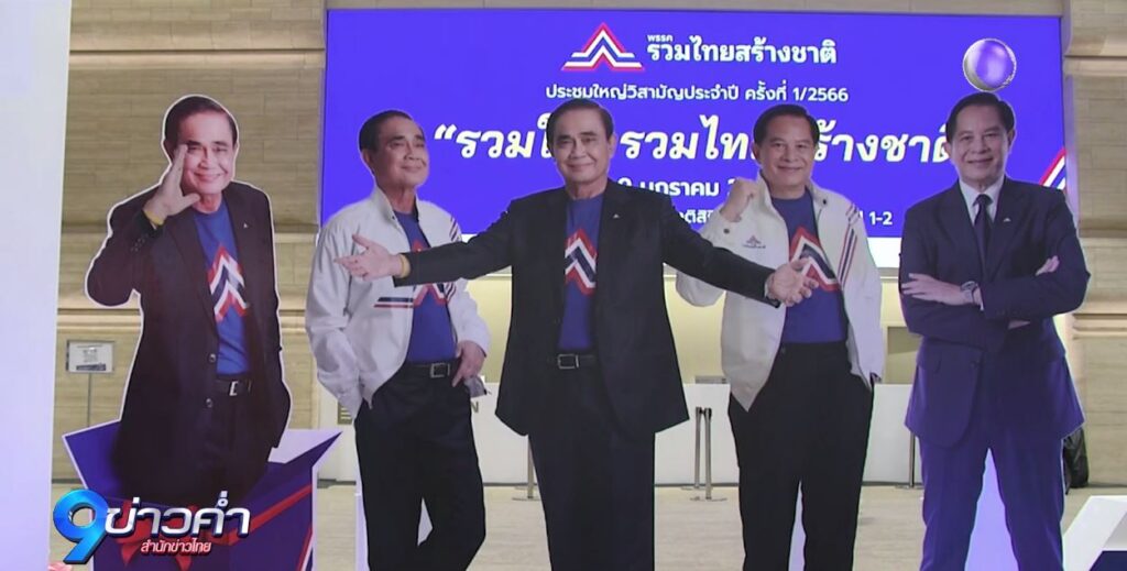 ส่วนบริเวณด้านหน้าห้องประชุม มีการติดตั้งป้ายชื่อพรรคขนาดใหญ่ และนำสแตนดี้ พลเอกประยุทธ์ สวมเสื้อแจ็คเก็ตของพรรครวมไทยสร้างชาติใน 3 อิริยาบถ ที่ดูสบายๆ และเป็นกันเองมาติดตั้งไว้ซึ่งมีประชาชนมาถ่ายรูปคู่เป็นจำนวนมาก .-สำนักข่าวไทย