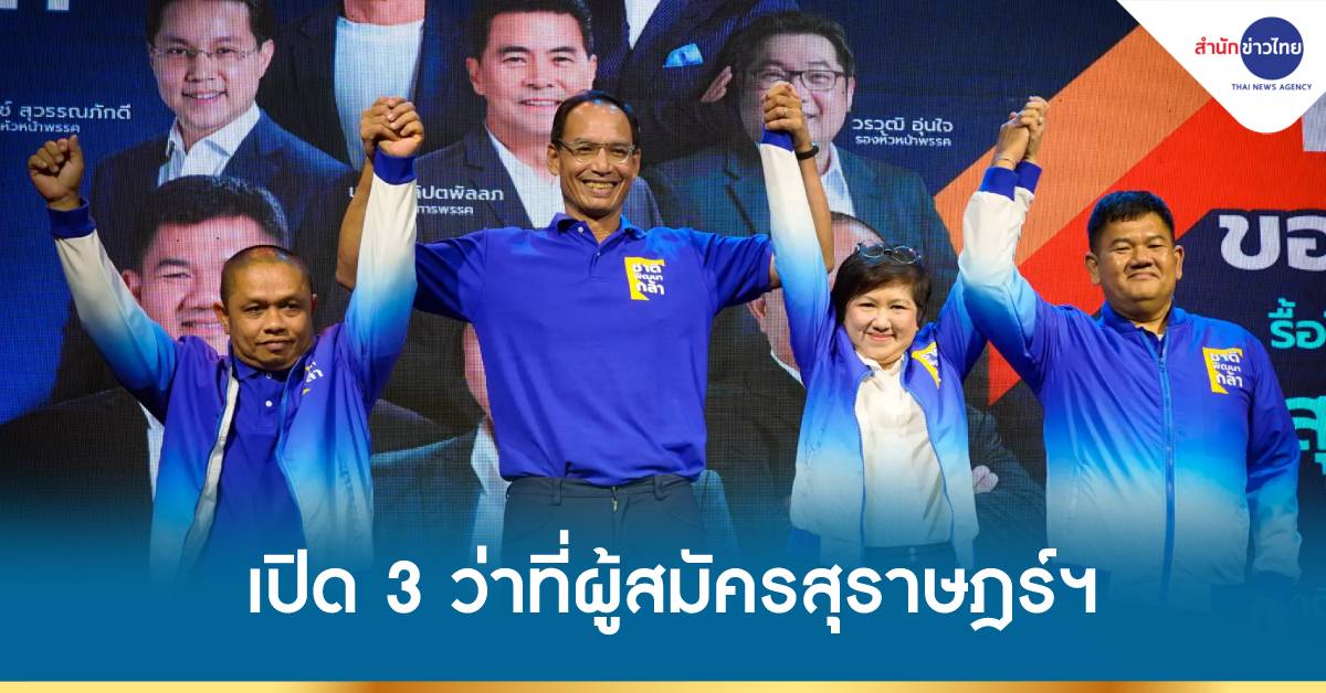 สำหรับว่าผู้สมัคร ส.ส.สุราษฎร์ธานี ที่ร่วมแสดงวิสัยทัศน์ในวันนี้ มี 3 คน จาก 3 เขตเลือกตั้ง คือ เขตเลือกตั้งที่ 1 ได้แก่ นายอนุวัตร์ รจิตานนท์ เขตเลือกตั้งที่ 2 นางพงศ์ศรี นาคเมือง เขตเลือกตั้งที่ 5 นายวศุธน เรืองขนาบ ซึ่งว่าที่ผู้สมัครทั้ง 3 คน เป็นคนที่มีความรู้ ความสามารถ มีความตั้งใจ และพร้อมที่จะนำประสบการณ์การทำงานมาพัฒนาสุราษฎร์ธานีให้เข้มแข็ง เพื่อชีวิตความเป็นอยู่ของชาว จ.สุราษฎร์ธานี ให้ดีขึ้น โดยทุกคนได้ลงพื้นที่พบปะพี่น้องประชาชนอย่างต่อเนื่อง ได้รับการตอบรับจากพี่น้องประชาชนอย่างกว้างขวาง