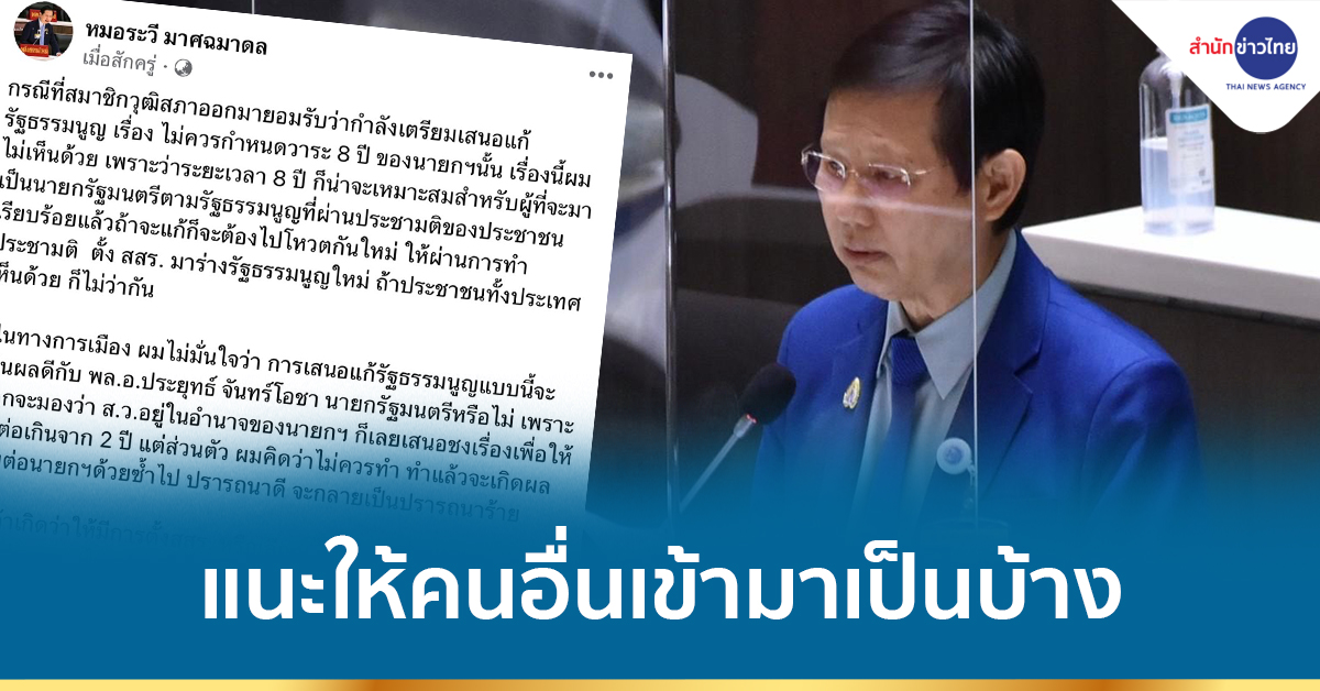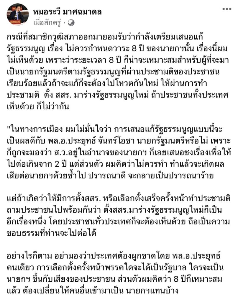 “ส่วนตัวผมคิดว่าไม่ควรทำ ทำแล้วจะเกิดผลเสียต่อนายกฯด้วยซ้ำไป ปรารถนาดีกลายเป็นปรารถนาร้าย แต่ถ้าเกิดว่าให้มีการตั้งสสร. หรือเลือกตั้งเสร็จครั้งหน้าทำประชามติถามประชาชนไปพร้อมกันว่าตั้งสสร.มาร่างรัฐธรรมนูญใหม่ก็โอเค เวลาประมาณ 2 ปีก็พอดี ก่อนที่นายกฯจะหมดวาระ สสร.ก็อาจจะเสร็จได้รธน.ใหม่ออกมา โดยประชาชนทั่วประเทศก็เห็นด้วย ก็เป็นความชอบธรรมที่ท่านจะไปต่อได้ อย่างไรก็ตาม อย่ามองว่าประเทศต้องผูกขาดโดย พล.อ.ประยุทธ์ คนเดียว การเลือกตั้งครั้งหน้าพรรคใดจะได้เป็นรัฐบาล ใครจะเป็นนายกฯ ขึ้นกับเสียงของประชาชน ส่วนตัวผมคิดว่า 8 ปีก็เหมาะสมแล้ว ต้องเปลี่ยนให้คนอื่นเข้ามาเป็น นายกฯแทนบ้าง” .-สำนักข่าวไทย