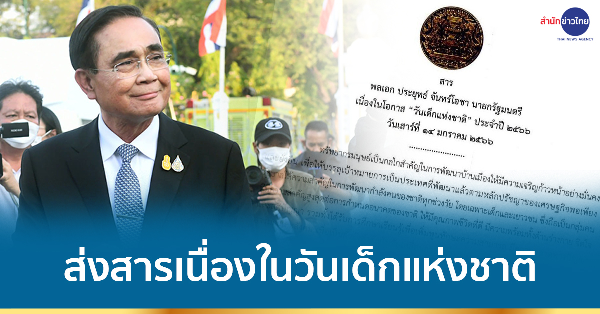 พลเอก ประยุทธ์ จันทร์โอชา นายกรัฐมนตรี ส่งสารเนื่องในโอกาส “วันเด็กแห่งชาติ” ประจำปี ๒๕๖๖ ว่า ทรัพยากรมนุษย์เป็นกลไกสำคัญในการพัฒนาบ้านเมืองให้มีความเจริญก้าวหน้าอย่างมั่นคง และยั่งยืน เพื่อให้บรรลุเป้าหมายการเป็นประเทศที่พัฒนาแล้วตามหลักปรัชญาของเศรษฐกิจพอเพียง รัฐบาลให้ความสำคัญในการพัฒนากำลังคนของชาติทุกช่วงวัย โดยเฉพาะเด็กและเยาวชน ซึ่งถือเป็นกลุ่มคนที่มีความสำคัญสูงสุดต่อการกำหนดอนาคตของชาติ ให้มีคุณภาพชีวิตที่ดี มีความพร้อมทั้งด้านร่างกาย จิตใจและสติปัญญา รวมทั้งได้รับการศึกษาเรียนรู้เพื่อเพิ่มพูนทักษะความสามารถ มีความฉลาดทางปัญญาอารมณ์และสังคม เพื่อเป็นกำลังสำคัญในขับเคลื่อนการพัฒนาประเทศให้มีความเจริญก้าวหน้าต่อไปในอนาคต