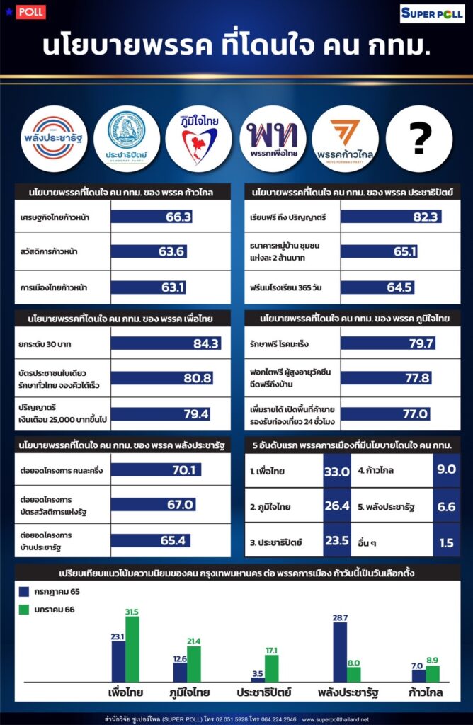 ผศ.ดร.นพดล กรรณิกา ผู้อำนวยการสำนักวิจัยซูเปอร์โพล (SUPER POLL) เปิดเผยผลสำรวจเรื่อง “นโยบายพรรคที่โดนใจ คน กทม.”กรณีศึกษาประชาชนทุกสาขาอาชีพทั่วประเทศ จำนวน 1,207 ตัวอย่าง ระหว่างวันที่ 12 – 15 ธันวาคม 2566 โดยเมื่อถามถึงนโยบายพรรคที่โดนใจ คน กทม. ของพรรคการเมืองต่าง ๆ พบว่า นโยบายพรรคก้าวไกลที่โดนใจคน กทม. ใน 3 อันดับแรก ได้แก่ เศรษฐกิจไทยก้าวหน้า ร้อยละ 66.3 รองลงมาคือ สวัสดิการก้าวหน้า ร้อยละ 63.6 และอันดับสามได้แก่ การเมืองไทยก้าวหน้า ร้อยละ 63.1 ในขณะที่ นโยบายพรรคเพื่อไทยที่โดนใจคน กทม. ใน 3 อันดับแรก ได้แก่ ยกระดับ 30 บาท ได้ร้อยละ 84.3 อันดับสองได้แก่ บัตรประชาชนใบเดียว รักษาทั่วไทย จองคิวได้เร็ว ร้อยละ 80.8 และอันดับสามได้แก่ ปริญญาตรีเงินเดือน 25,000 บาทขึ้นไป ร้อยละ 79.4 ตามลำดับ ในขณะที่ นโยบายพรรคที่โดนใจ คน กทม. ของพรรคพลังประชารัฐ ใน 3 อันดับแรก ได้แก่ ต่อยอดโครงการ คนละครึ่ง ร้อยละ 70.1 อันดับสองได้แก่ ต่อยอดโครงการบัตรสวัสดิการแห่งรัฐ ร้อยละ 67.0 และอันดับสามได้แก่ ต่อยอดโครงการบ้านประชารัฐ ร้อยละ 65.4