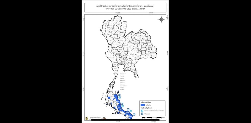 ปภ. 19 ม.ค.- ปภ.แจ้ง 11 จังหวัดภาคใต้ เตรียมรับมือน้ำท่วมฉับพลัน-น้ำป่าไหลหลาก-คลื่นลมแรง ช่วง 20 – 25 ม.ค.66 ด้าน มท.สั่งเฝ้าระวังสถานการณ์ภัย เตรียมพร้อมเผชิญเหตุ ช่วยเหลือประชาชน