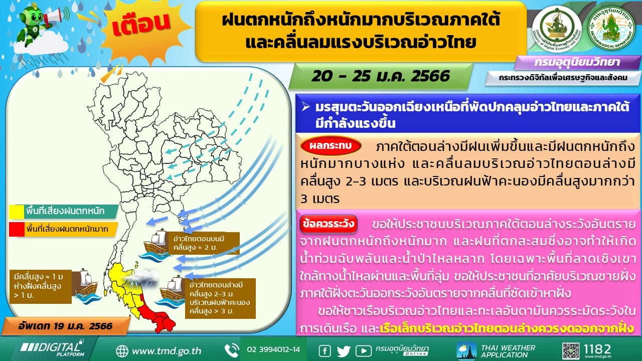 กรมป้องกันและบรรเทาสาธารณภัย (ปภ.) กระทรวงมหาดไทยในฐานะกองอำนวยการป้องกันและบรรเทาสาธารณภัยกลาง (กอปภ.ก.) ได้ติดตามสภาวะอากาศและพิจารณาปัจจัยเสี่ยง ประกอบกับกรมอุตุนิยมวิทยาได้มีประกาศฉบับที่ 1 (22/2566) ลงวันที่ 19 มกราคม 2566 เวลา 05.00 น. แจ้งว่ามรสุมตะวันออกเฉียงเหนือที่พัดปกคลุมอ่าวไทยและภาคใต้มีกำลังแรงขึ้น ทำให้บริเวณภาคใต้จะมีฝนเพิ่มขึ้นและมีฝนตกหนักถึงหนักมากบางพื้นที่ สำหรับคลื่นลมบริเวณอ่าวไทยตอนล่างจะมีกำลังแรง มีคลื่นสูง 2-3 เมตร บริเวณที่มีฝนฟ้าคะนองคลื่นสูงมากกว่า 3 เมตร โดยมีพื้นที่เฝ้าระวังสถานการณ์ ระหว่างวันที่ 20 – 25 มกราคม 2566 ดังนี้