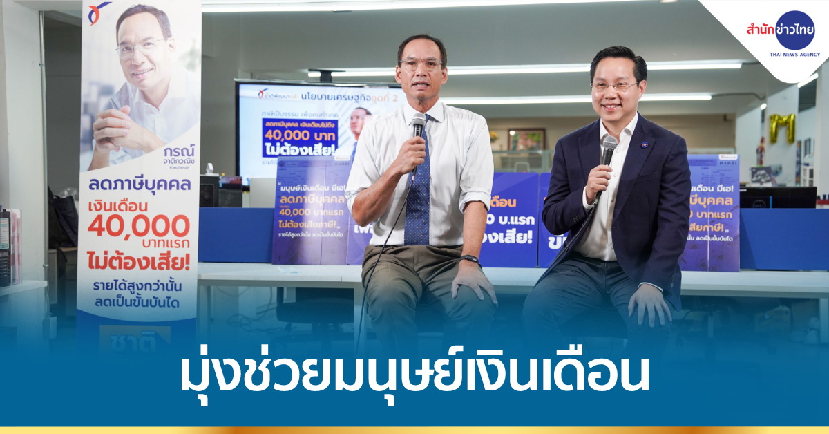 กรุงเทพฯ 21 ม.ค. – “ชาติพัฒนากล้า” ปล่อยของต่อเนื่อง เปิดนโยบายเศรษฐกิจชุดที่ 2 “เงินเดือน 40,000 บาทแรก ไม่ต้องเสียภาษี” ติดปีกให้คนธรรมดา พุ่งเป้าช่วยมนุษย์เงินเดือน เตรียมเปิดนโยบายชุดใหญ่อังคารนี้