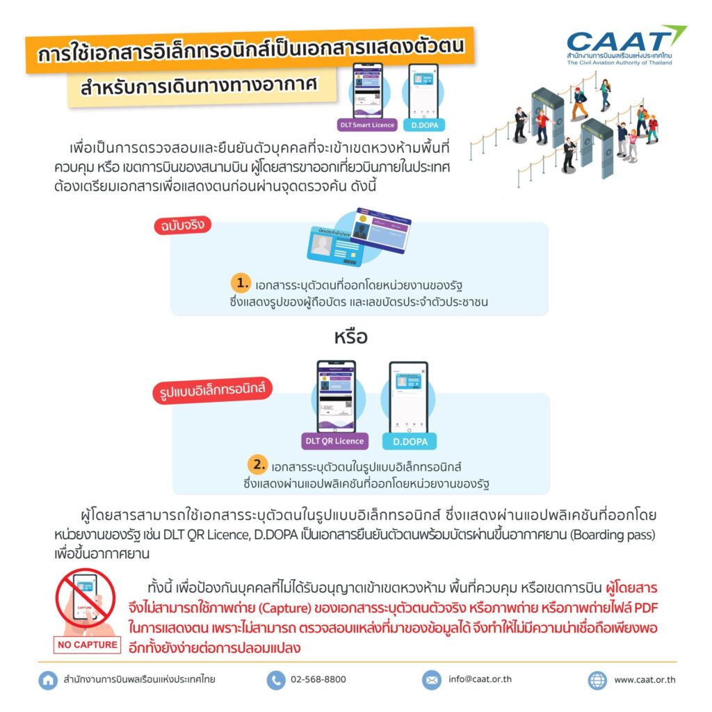 ทั้งนี้ ผู้โดยสารสามารถใช้เอกสารระบุตัวตนในรูปแบบอิเล็กทรอนิกส์ ซึ่งเเสดงผ่านแอปพลิเคชันที่ออกโดย หน่วยงานของรัฐดังกล่าว เป็นเอกสารยืนยันตัวตนพร้อม Boarding pass เพื่อขึ้นอากาศยานได้ “เพื่อป้องกันบุคคลที่ไม่ได้รับอนุญาตเข้าเขตหวงห้าม พื้นที่ควบคุม หรือเขตการบิน กพท. ไม่อนุญาตให้ใช้ภาพถ่าย หรือ การ Capture ภาพของเอกสารระบุตัวตนตัวจริงหรือภาพถ่ายไฟล์ PDF ในการเเสดงตนได้ เนื่องจากไม่สามารถตรวจสอบแหล่งที่มาของข้อมูลได้ ไม่มีความน่าเชื่อถือเพียงพอ อีกทั้งยังง่ายต่อการปลอมแปลง” น.ส.ไตรศุลี กล่าว .- สำนักข่าวไทย