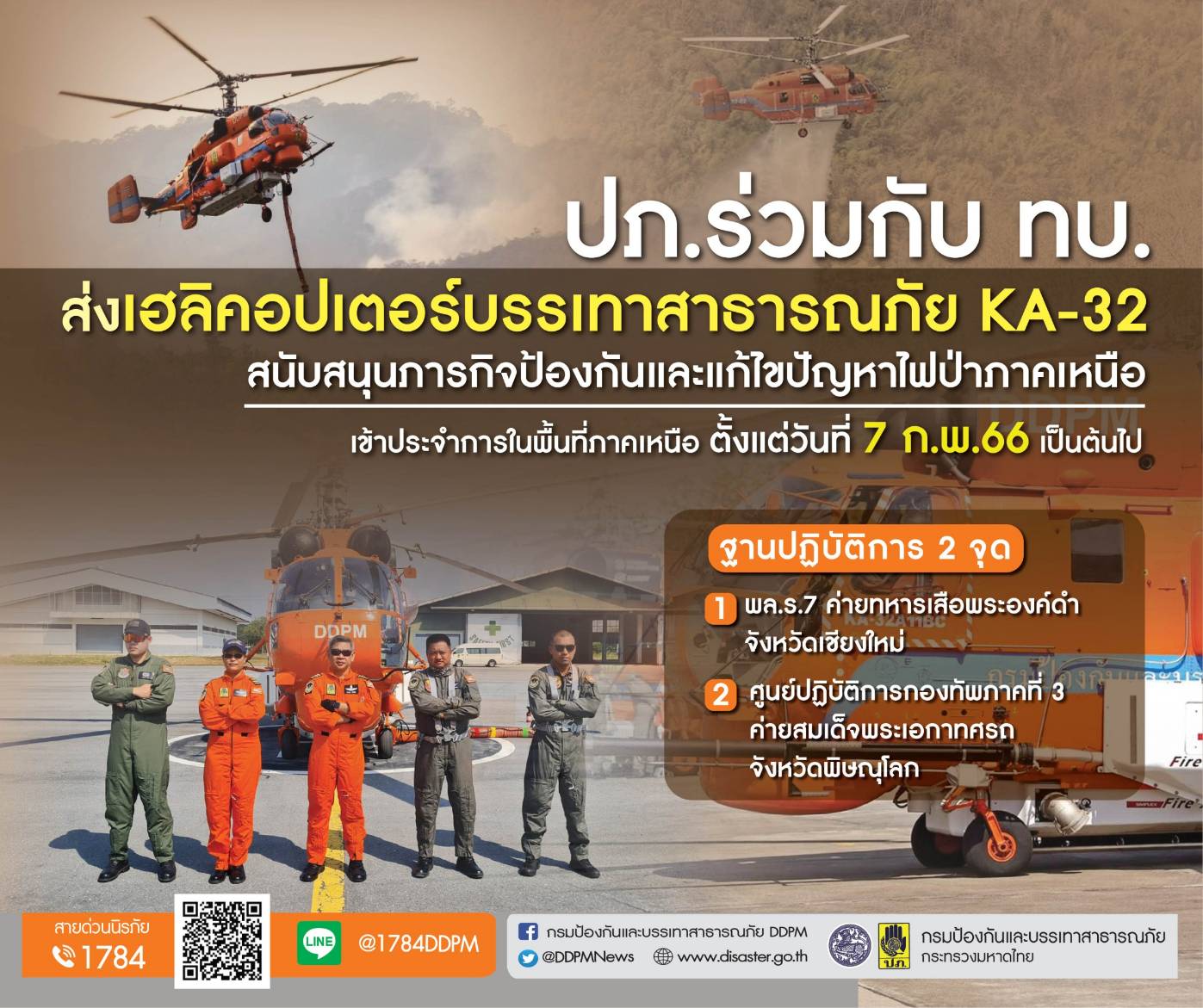 ปภ.3 ก.พ.-ปภ.จับมือ ทบ. ส่งเฮลิคอปเตอร์บรรเทาสาธารณภัย KA-32 ขึ้นประจำการภาคเหนือ สนับสนุนภารกิจคุมไฟป่า หมอกควันตั้งแต่ 7 ก.พ.66 จนกว่าสถานการณ์คลี่คลาย