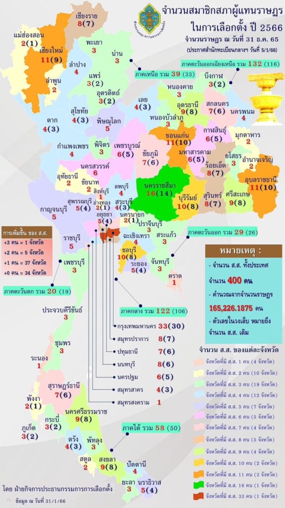 สำนักงานคณะกรรมการการเลือกตั้ง ชี้แจง หลังออกประกาศคณะกรรมการการเลือกตั้ง เรื่อง การแบ่งเขตเลือกตั้งสมาชิกสภาผู้แทนราษฎร พ.ศ. 2566 และประกาศคณะกรรมการการเลือกตั้ง เรื่อง จำนวน ส.ส.และเขตเลือกตั้งของแต่ละจังหวัด ในการเลือกตั้ง ส.ส.เป็นการทั่วไปครั้งแรก โดยให้สำนักงาน กกต. ประจำจังหวัดดำเนินการแบ่งเขตเลือกตั้ง ซึ่งจังหวัดที่มีจำนวน ส.ส.มากกว่า 1 คน ให้ผู้อำนวยการการเลือกตั้งประจำจังหวัดจัดทำรูปแบบการแบ่งเขตเลือกตั้งภายใน 3 วัน โดยต้องแบ่งพื้นที่ของเขตเลือกตั้งแต่ละเขต ให้ติดต่อกันและต้องจัดให้มีจำนวนราษฎรในแต่ละเขตเลือกตั้งใกล้เคียงกัน แล้วประกาศรูปแบบการแบ่งเขตเลือกตั้งอย่างน้อย 3 รูปแบบ เพื่อรับฟังความคิดเห็นของพรรคการเมืองและประชาชนในจังหวัดเป็นเวลา 10 วัน