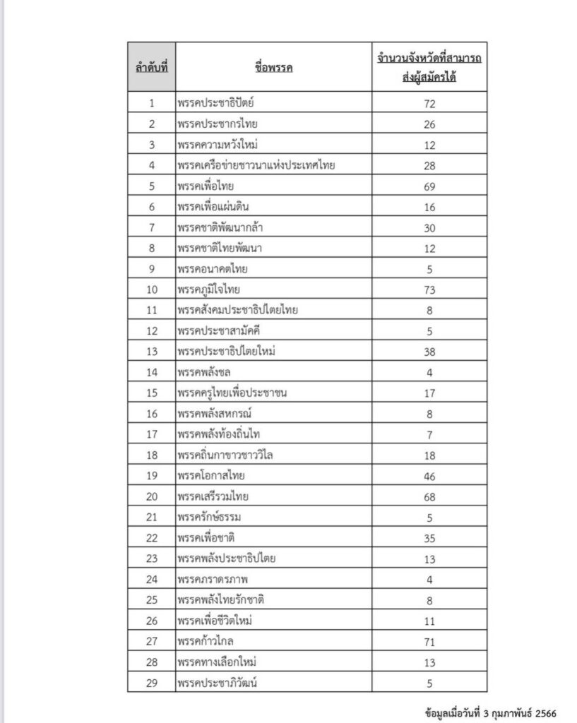 ผู้สื่อข่าวรายงานว่าจากข้อมูลพรรคการเมืองที่ดำเนินกิจการอยู่ ณ วันที่ 3 ธันวาคม 2566 จำนวน 86 พรรคการเมือง พบว่าในระบบฐานข้อมูลสมาชิกพรรคการเมือง ยังไม่มีพรรคการเมืองใดที่สามารถส่งผู้สมัครลงรับเลือกตั้ง ส.ส.ได้ครบ 77 จังหวัด เนื่องจากยังไม่มีสาขาหรือตัวแทนพรรคการเมืองประจำจังหวัดตามที่มาตรา 47 พ.ร.ป. ว่าด้วยพรรคการเมือง (ฉบับที่2) 2566 กำหนดโดย 10 พรรคการเมืองที่ส่งผู้สมัครได้มากที่สุดในขณะนี้คือ 1.พรรคภูมิใจไทย 73 จังหวัด 2.พรรคประชาธิปัตย์ 72 จังหวัด 3.พรรคเพื่อไทย 69 จังหวัด 4.พรรคเสรีรวมไทย 68 จังหวัด 5. พรรคพลังประชารัฐ 64 จังหวัด 6.พรรคเศรษฐกิจไทย 59 จังหวัด 7.พรรคคลองไทย 55 จังหวัด 8.พรรครวมไทยสร้างชาติ 50 จังหวัด 9.พรรคไทยสร้างไทย 48 จังหวัด 10. พรรคโอกาสไทย 46 จังหวัด