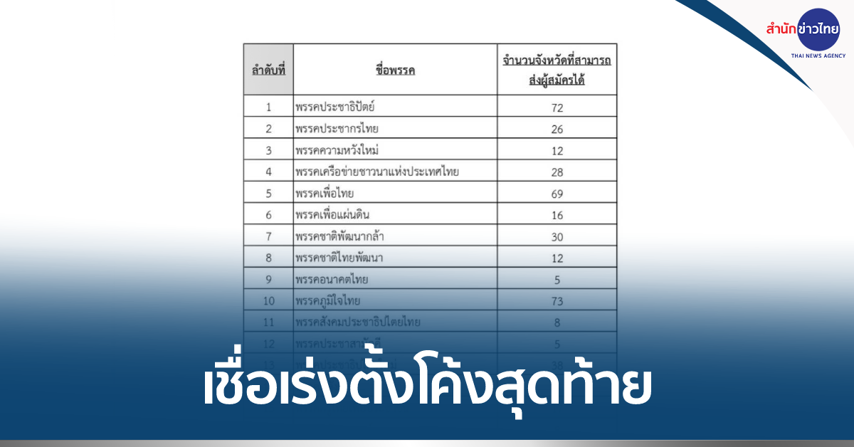 กกต. 6 ก.พ. – กกต. เปิดข้อมูล 86 พรรคตั้งสาขา-ตัวแทนพรรคการเมืองประจำจังหวัด ภูมิใจไทยอันดับหนึ่ง ส่งผู้สมัครได้ 73 จังหวัด ประชาธิปัตย์ 72 จังหวัด เพื่อไทย 69 จังหวัด ส่วนพรรคลุงป้อม 64 จังหวัด พรรคลุงตู่ 50 จังหวัด เชื่อทุกพรรคเร่งตั้งช่วงโค้งสุดท้าย