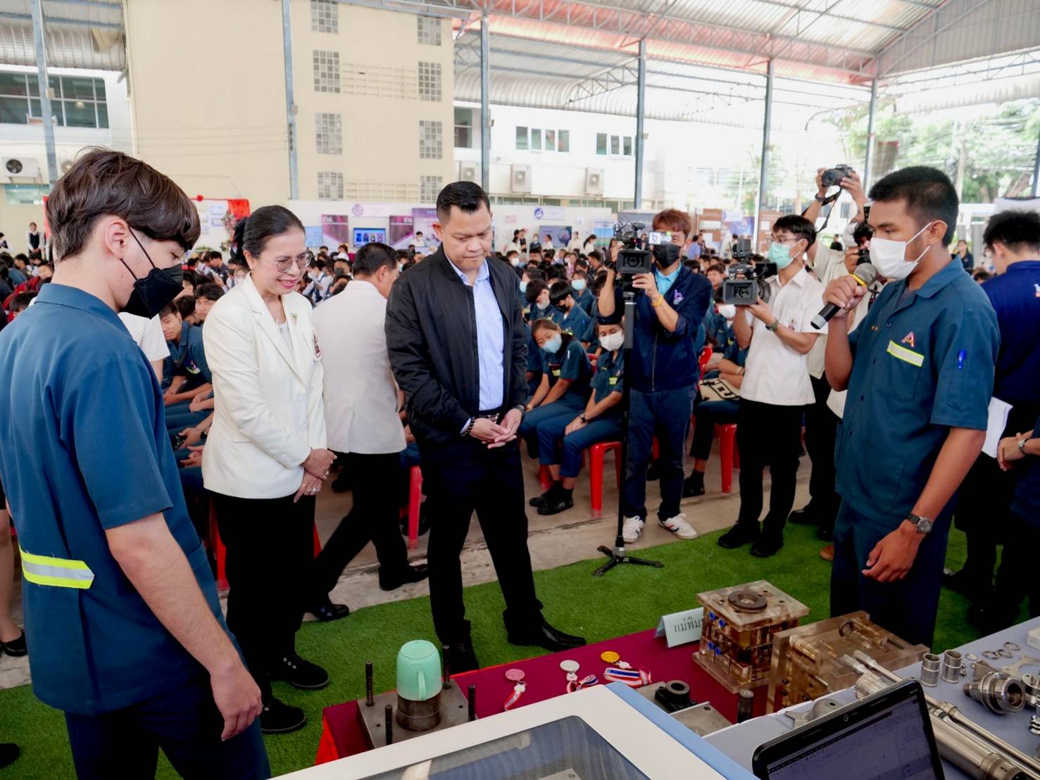จากนั้นในช่วงบ่าย รัฐมนตรีประจำสำนักนายกรัฐมนตรี ได้เดินทางไปยังวิทยาลัยเทคนิคสัตหีบ เยี่ยมชมผลงานของนักศึกษาและติดตามโครงการสัตหีบโมเดล ซึ่งเป็นการพัฒนากำลังคนอาชีวศึกษาสู่ตลาดแรงงานภาคอุตสาหกรรมในเขตพัฒนาพิเศษภาคตะวันออก ทั้งนี้ ได้ร่วมกิจกรรมสื่อสร้างสรรค์ รัฐ-ประชาชน โดยได้พูดคุย-รับฟังปัญหากับกลุ่มนักศึกษาและชุมชนในพื้นที่ในหลากหลายประเด็น เช่น แนวทางการพัฒนาอาชีพต่อการเติบโตของ EEC การส่งเสริมการท่องเที่ยวชุมชน เป็นต้น