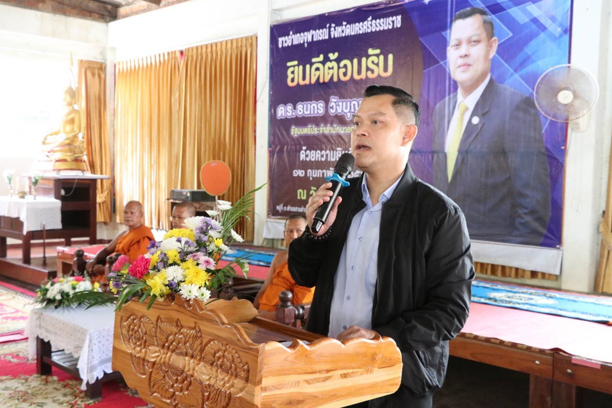 นายธนกร กล่าวว่า ได้เข้ากราบนมัสการเจ้าอาวาสวัดวังฆ้อง ตำบลสามตำบล อำเภอจุฬาภรณ์ ก่อนพบปะกับพี่น้องประชาชนและส่วนราชการที่มารอรับจำนวนมาก บริเวณลานอเนกประสงค์วัดวังฆ้อง เพื่อรับฟังปัญหาและความต้องการของประชาชนในพื้นที่ ซึ่งนายประสงค์ จันหยู นายอำเภอจุฬาภรณ์ ได้รายงานถึงปัญหาและความต้องการของประชาชนในพื้นที่ ในเรื่องของปัญหาน้ำท่วมน้ำแล้งที่เกิดขึ้นเป็นประจำทุกปี จึงมีความจำเป็นต้องสร้างอ่างเก็บน้ำเพื่อเป็นแก้มลิงเก็บน้ำในช่วงหน้าฝน และกักน้ำไว้เพื่ออุปโภคบริโภคและทำการเกษตรในช่วงหน้าแล้ง รวมถึงปัญหาด้านการศึกษา เนื่องจากไม่มีสถานศึกษาด้านอาชีพเพื่อส่งเสริมการศึกษาและการสร้างอาชีพในพื้นที่ ปัจจุบันการเรียนส่วนใหญ่ต้องเดินทางไปศึกษาในตัวเมืองและจังหวัดพัทลุง และปัญหาด้านราคาพืชผลการผลิตที่ไม่แน่นอน