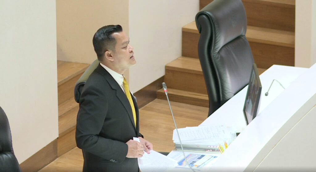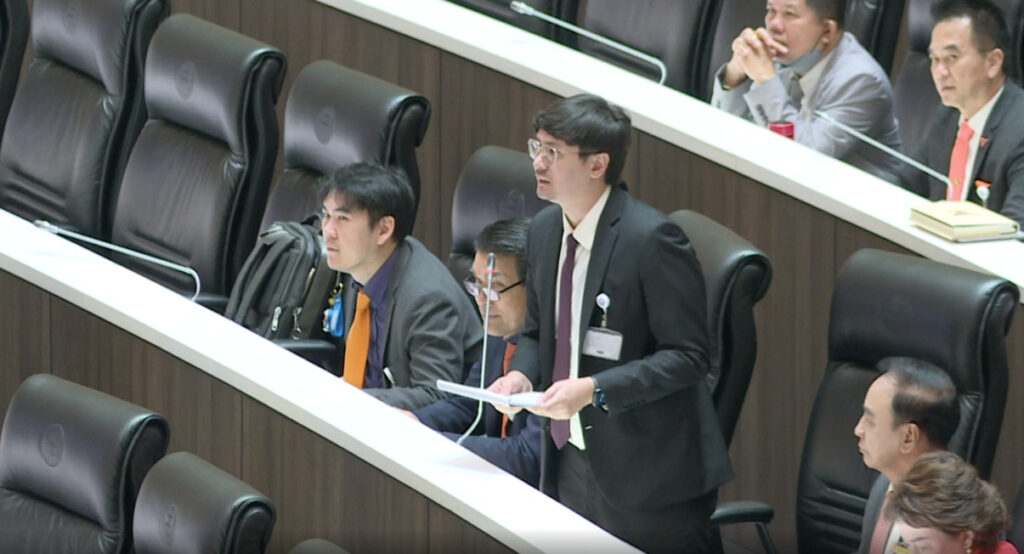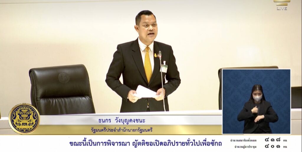 จากนั้นนายธนกร วังบุญคงชนะ รัฐมนตรีประจำสำนักนายกรัฐมนตรี ชี้แจงแทนนายกรัฐมนตรี ว่า มีการอภิปรายพาดพิงถึงพรรครวมไทยสร้างชาติ ตนในฐานะสมาชิกของพรรค มองว่าเป็นการกล่าวหาทำให้ประชาชนเข้าใจผิด สับสน และตนได้รับความเสียหาย ซึ่งการเช่าตึกเป็นที่ทำการพรรค ได้ทำอย่างถูกต้องตามกฏหมาย และอดีตส.ว. ที่กล่าวหา ไม่ได้มีหุ้นอยู่ด้วย และได้มีการดำเนินมาตั้งแต่ปี 2562 และไม่สามารถรู้ว่าใครไปเกี่ยวข้องบ้าง แต่ย้ำว่าทุกอย่างเป็นไปตามกฎหมาย ขณะเดียวกันตนขอกล่าวหาทางพรรคก้าวไกลบ้าง ในเรื่องของตึกไทยซัมมิท ว่าเจ้าของไปเกี่ยวข้องกับคดีรุกป่า หรือให้สินบนใต้โต๊ะ ตนก็เชื่อว่าพวกท่านไม่เกี่ยวข้อง คงเป็นตรรกะเดียวกัน ดังนั้นขออย่ามาพูดจาแบบนี้เพราะไม่เป็นธรรม ขอให้นำข้อเท็จจริงมาพูด ซึ่งตนได้มีการพูดกับนายพีระพันธุ์ สาลีรัฐวิภาค หัวหน้าพรรครวมไทยสร้างชาติ เมื่อคืนที่ผ่านมา (15 ก.พ.) และระบุว่าพร้อมที่จะชี้แจงบนเอกสารหลักฐานต่างๆ และนายกรัฐมนตรี ยังได้มีการชี้แจงไปแล้วด้วย การอภิปรายแบบนี้ ตนคิดว่าไม่เป็นธรรม และย้ำว่าหัวหน้าพรรคขึ้นชื่อเรื่องความซื่อสัตย์สุจริต