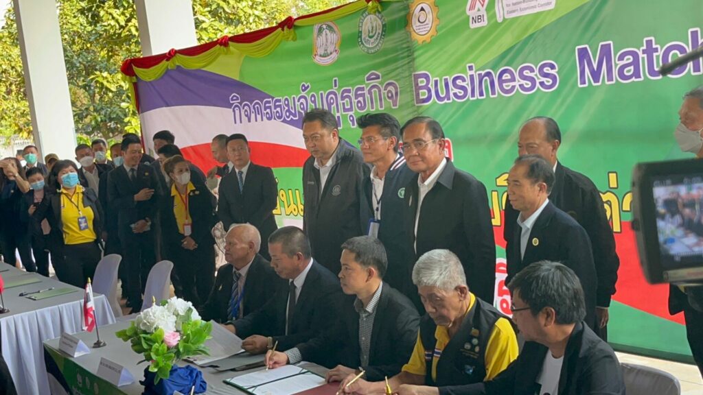 จากนั้น นายกฯ เป็นสักขีพยานในโอกาสการลงนามการจับคู่ธุรกิจ โดยบันทึกความร่วมมือในการทำธุรกิจร่วมกันในประเทศไทย และเยี่ยมชมนิทรรศการการประยุกต์และพัฒนาเทคโนโลยีทางการเกษตรอุตสาหกรรม ที่ตอบสนองต่อความต้องการของตลาด พร้อมกันนี้ ได้ทดลอง กรีดยาง ด้วยเครื่องกรีดยางไฟฟ้า สวมถุงมือผ้าเคลือบยางฟองน้ำ ขณะที่ มีประชาชนมามอบดอกไม้ให้กำลังใจนายกฯ ด้วย .-สำนักข่าวไทย