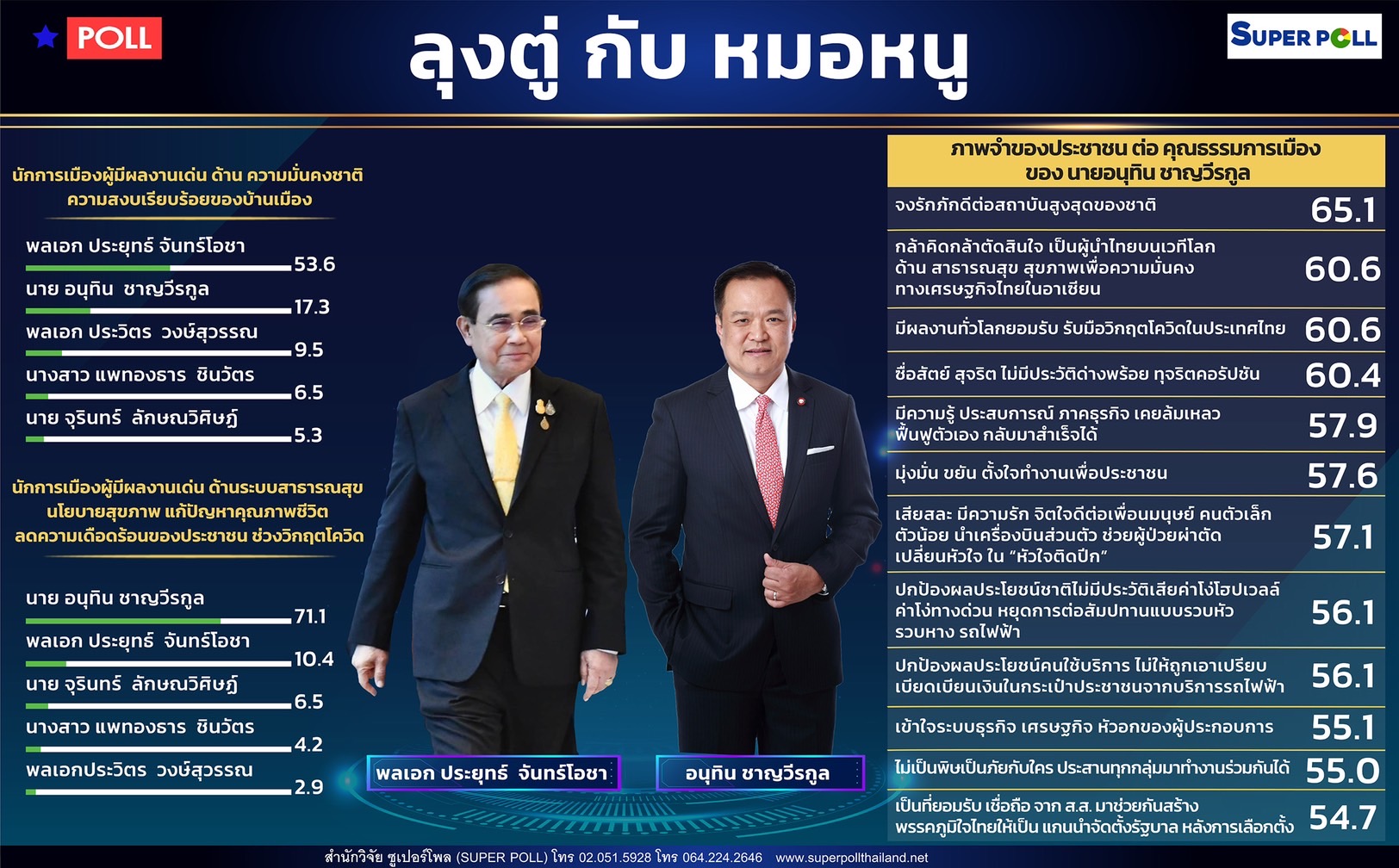สำนักวิจัยซูเปอร์โพล กล่าวว่า ผลโพลชิ้นนี้ชี้ให้เห็นว่า จากผลโพลก่อนหน้านี้ที่เคยทำเรื่อง ลุงตู่ กับ คุณธรรมการเมืองพบว่ามีความเหมือนในบางด้านแต่หลายด้านที่แตกต่างกันไปจากภาพจำของประชาชนต่อคุณธรรมการเมืองของ หมอหนู หรือ นายอนุทิน ชาญวีรกูล เช่น ทั้ง ลุงตู่ และหมอหนู ต่างได้รับการยอมรับจากประชาชนเรื่องความจงรักภักดีและผลงานอันเป็นที่ยอมรับจากนานาประเทศทั่วโลกโดยเฉพาะผลงานด้านระบบสาธารณสุข นโยบายสุขภาวะของประชาชน สุขภาพเพื่อความมั่นคงทางเศรษฐกิจของประเทศในอาเซียน ความซื่อสัตย์สุจริตและความสามารถพลิกฟื้นวิกฤติที่เคยเกิดกับธุรกิจของตัวเองจนประสบความสำเร็จเจริญมั่งคง จึงได้รับการโหวตจากประชาชนในความสำเร็จที่สามารถฟันฝ่าปัญหาธุรกิจในยามวิกฤตเศรษฐกิจของประเทศ เข้าใจหัวอกของผู้ประกอบการและความเดือดร้อนของประชาชน นอกจากนี้ ที่โดดเด่นในลักษณะคุณธรรมของนายอนุทิน ชาญวีรกูล ที่ลงมือปฏิบัติด้วยตนเองตั้งแต่ก่อนการทำงานทางการเมืองคือ เสียสละ มีความรัก จิตใจดีต่อเพื่อนมนุษย์ คนตัวเล็กตัวน้อย นำเครื่องบินส่วนตัว ช่วยผู้ป่วยผ่าตัดเปลี่ยนหัวใจ ใน “หัวใจติดปีก”