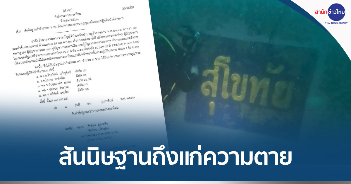 กรุงเทพฯ 28 ก.พ. – กลาโหมมีคำสั่ง สันนิษฐานว่ากำลังพล 5 นาย ของเรือหลวงสุโขทัยที่ยังสูญหาย ถึงแก่ความตายแล้ว เพื่อให้ญาติได้รับสิทธิบำเหน็จบำนาญ ตาม พ.ร.บ.บำเหน็จบำนาญข้าราชการ