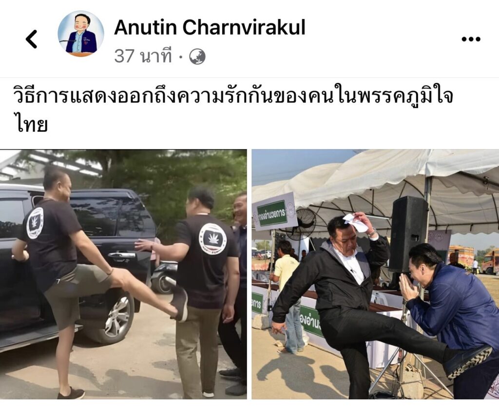 ผู้สื่อข่าวรายงานว่า นายอนุทิน ชาญวีรกูล รองนายกรัฐมนตรี และรัฐมนตรีว่าการกระทรวงสาธารณสุข ในฐานะหัวหน้าพรรคภูมิใจไทย โพสต์เฟซบุ๊กส่วนตัว “Anutin Charnvirakul” เป็นภาพของนายเนวิน ชิดชอบ ประธานสโมสรฟุตบอลบุรีรัมย์ ยูไนเต็ด ที่กำลังยกเท้าในลักษณะเตะหยอกล้อกับนายอนุทิน ขณะที่อีกภาพนายอนุทิน กำลังใช้เท้าเตะหยอกล้อ นายยศวัฒน์ มาไพศาลสิน ส.ส.กาญจนบุรี พรรคภูมิใจไทย พร้อมระบุ แคปชั่นว่า “วิธีการแสดงออกถึงความรักกันของคนในพรรคภูมิใจไทย”
